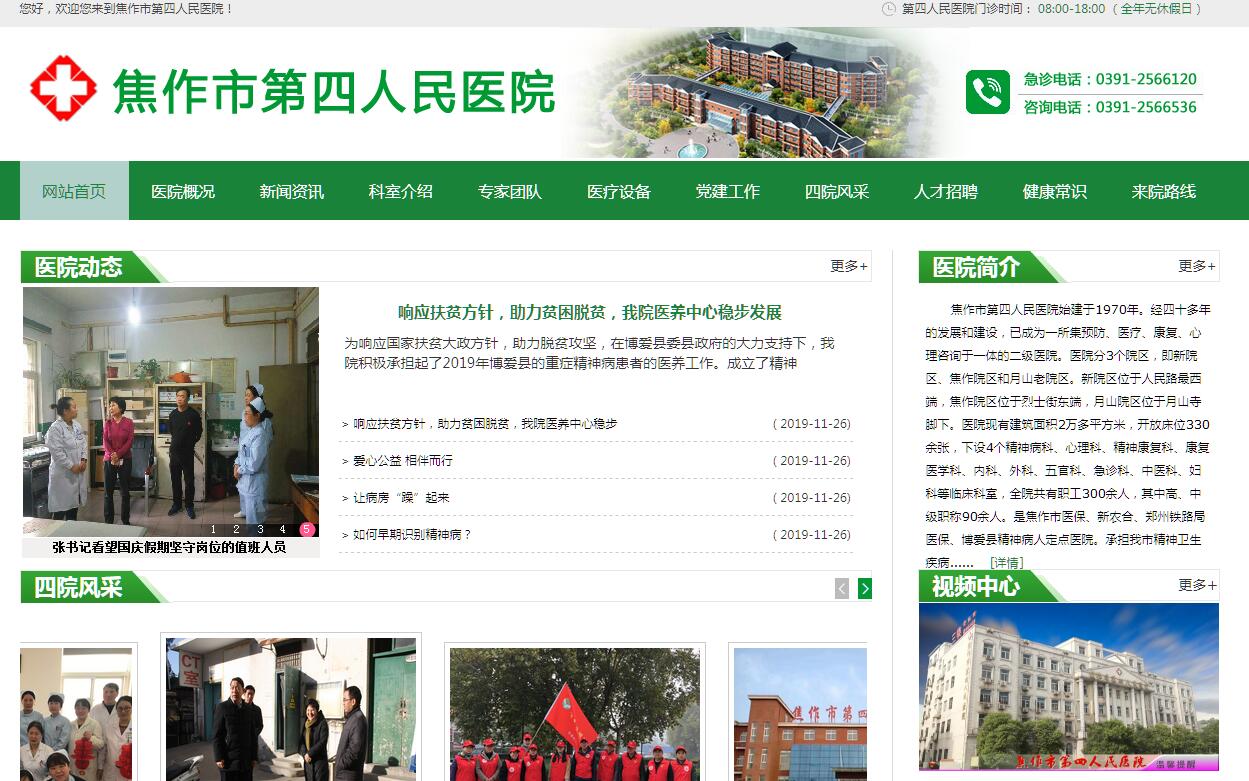 焦作市第四人民医院始建于1970年。经四十多年的发展和建设,已成为一所集预防、医疗、康复、心理咨询于一体的二级医院。医院分3个院区,即新院区、焦作院区和月山老院区。新院区位于人民路最西端,焦作院区位于烈士街东端,月山院区位于月山寺脚下。医院现有建筑面积2万多平方米,开放床位330余张,下设4个精神病科、心理科、精神康复科、康复医学科、内科、外科、五官科、急诊科、中医科、妇科等临床科室,全院共有职工300余人,其中高、中级职称90余人。是焦作市医保、新农合、郑州铁路局医保、博爱县精神病人定点医院。承担我市精神卫生疾病的预防、治疗、科研、教学等任务,多次被评为河南省和焦作市先进单位。目前,由中央投资兴建的焦作市精神病医院已经建成,已于去年12月份投入试用。新医院总建筑面积17000平方米的病房楼项目,床位330张,占地88.8亩。新院投入使用后,必将大大改善焦作市精神疾病患者的就医条件和医务人员的工作环境,也为进一步加快焦作市精神卫生防治体系的建设步伐,提高焦作市精神疾病的防治能力提供了坚实的保障。医院医疗设备齐全,拥有飞利浦的CT、西门子彩超、心理CT、500mAX光机、DR数字化X光机、C型臂、全自动生化分析仪、经颅磁电刺激仪、德国产电视腹腔镜、团体生物反馈治疗仪、精神压力分析仪、多参数无抽搐电休克治疗仪、智能康复训练系统、神经网络重建仪等80余种大型医疗设备。特色科室:精神病科——精神病患者的康复家园。该科创建于1991年,是我市的精神病“市级特色专科”,在治疗抑郁症、强迫症、社交恐怖症、焦虑症、疑病症、适应障碍、应激障碍等方面处于全市领先地位,曾先后承担多项科研课题,拥有十分雄厚的实力。心理咨询科——打开人心结的地方。成立于1994年的心理咨询科,针对各种情绪障碍、适应障碍、品行障碍、人格障碍、性心理障碍、应激后心理障碍、心理因素相关的生理障碍及儿童青少年发育障碍等疾病的诊治和心理咨询。帮助了许多心理疾病患者重新认识了自我,提高了患者的自信心。康复医学科——让偏瘫患者从这里站起。医院偏瘫康复科是焦作市成立较早的康复医学科,从2003年建科至今,偏瘫康复科已使几千名偏瘫患者告别了残疾,回归了家庭和社会,偏瘫康复科一直保持“市级特色专科”的荣誉称号。