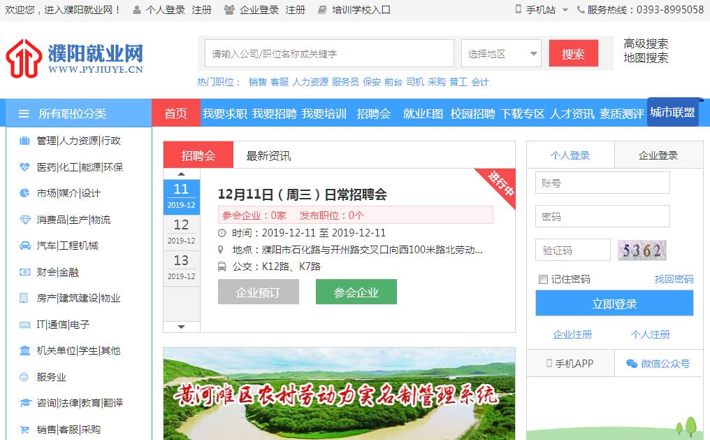 | 网站简介: 濮阳就业网隶属于濮阳市人力资源和社会保障局,为求职者提供职位搜索,企业招聘,招聘会网上预订,素质评测,培训信息等。现场招聘,手机招聘,自助服务,招聘外包,人事外包,人才派遣等.找工作聘人才就上濮阳就业网。濮阳市人力资源市场是隶属于市人力资源和社会保障局、由市劳动就业处日常管理的一所多功能综合性公共就业服务场所,主要面向用人单位及就业困难群体、高校毕业生、登记失业人员、农民工等各类求职人员组织招聘活动,并提供政策法规咨询、招聘求职信息发布、就业援助等服务,市场面积500平方米,拥有40个智能化招聘摊位,并配有全彩显示大屏,自助服务终端等服务设施。濮阳市人力资源市场每周会定期举办招聘会,敬请留意招聘会举办信息,期盼用人单位和求职人员免费入场洽谈。 |