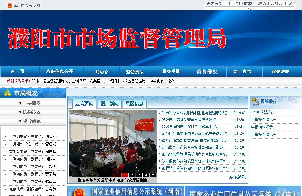 濮阳市市场监督管理局贯彻落实党中央关于市场监督管理工作的方针政策和决策部署,在履行职责过程中坚持和加强党对市场监督管理工作的集中统一领导。其主要职责是:(一)负责全市市场综合监督管理。贯彻执行国家、省市场监督管理有关法律法规和政策,制定有关政策、标准。组织实施质量强市战略、食品安全战略、标准化战略、知识产权战略。拟订并组织实施有关规划,规范和维护市场秩序,营造诚实守信、公平竞争的市场环境。(二)负责全市市场主体统一登记注册。组织指导全市各类企业、农民专业合作社和从事经营活动的单位、个体工商户以及授权范围内的外国(地区)企业常驻代表机构等市场主体的登记注册工作。建立市场主体信息公示和共享机制,依法公示和共享有关信息,加强信用监管,推动市场主体信用体系建设。(三)负责组织和指导全市市场监管综合执法工作。指导全市市场监管综合执法队伍建设。组织查处重大复杂案件,协调跨区域执法工作。规范全市市场监管行政执法行为。(四)负责全市反垄断统一执法。统筹推进竞争政策实施,指导实施公平竞争审查制度。根据授权,承担相关反垄断执法工作。(五)负责监督管理市场秩序。依法监督管理市场交易、网络商品交易及有关服务的行为。组织指导查处不正当竞争、违法直销、传销、侵犯商标专利知识产权和制售假冒伪劣行为。组织指导全市价格监督检查工作。指导全市广告业发展,监督管理广告活动。指导查处无照生产经营和相关无证生产经营行为。拟订全市消费者权益保护的具体措施,指导濮阳市消费者协会开展消费维权工作。(六)负责全市宏观质量管理。拟订并实施质量发展的制度措施。统筹全市质量基础设施建设与应用。会同有关部门组织实施重大工程设备质量监理制度,组织重大产品质量事故调查,组织实施缺陷产品召回制度,监督管理产品防伪工作。(七)负责全市产品质量安全监督管理。组织实施产品质量安全风险监控和监督抽查工作。组织实施质量分级制度、质量安全追溯制度。根据授权,全市工业产品生产许可管理工作。负责全市纤维质量监督工作。(八)负责全市特种设备安全监督管理。综合管理特种设备安全监察、监督工作,监督检查高耗能特种设备节能标准和锅炉环境保护标准的执行情况。组织指导特种设备安全事故调查工作。(九)负责全市食品安全监督管理综合协调。组织拟订全市食品安全政策措施并组织实施。负责食品安全应急体系建设,组织指导重大食品安全事件应急处置和调查处理工作。建立健全食品安全重要信息直报制度。承担濮阳市政府食品安全委员会的日常工作。(十)负责全市食品安全监督管理。建立覆盖全市食品生产、流通、消费全过程的监督检查制度和隐患排查治理机制并组织实施,防范区域性、系统性食品安全风险。推动建立食品生产经营者落实主体责任的机制,指导企业建立健全食品安全追溯体系。组织开展全市食品及相关产品安全监督抽检、风险监测、核查处置和风险预警、风险交流工作。组织实施全市特殊食品监督管理工作。(十一)负责全市药品(含中药、民族药,下同)安全监督管理。监督实施国家药品标准和分类管理制度,配合有关部门实施国家基本药物制度。监督和指导实施药品零售、使用质量管理规范。推动建立药品零售、使用单位落实主体责任的机制,指导建立健全药品安全追溯体系。组织实施药品零售许可和药品使用环节质量的检查、处罚。组织实施药品质量抽查检验。组织实施药品召回的监督管理工作。组织开展药品不良反应监测和处置工作。负责药物滥用监测工作。依法承担药品安全风险监测和应急管理工作。(十二)负责全市医疗器械安全监督管理。监督实施国家医疗器械标准和分类管理制度。监督和指导实施医疗器械经营、使用质量管理规范。推动建立医疗器械经营、使用单位落实主体责任的机制,指导建立健全医疗器械安全追溯体系。组织实施医疗器械经营许可和医疗器械经营、使用环节质量的检查和处罚。组织实施医疗器械质量抽查检验。组织实施医疗器械问题产品召回的监督管理工作。组织开展医疗器械不良事件监测和处置工作。依法承担医疗器械安全风险监测和应急管理工作。(十三)负责全市化妆品安全监督管理。监督实施国家化妆品标准和分类管理制度。监督实施化妆品相关质量管理规定。推动建立化妆品经营企业落实主体责任的机制,指导建立健全化妆品安全追溯体系。组织实施化妆品经营环节质量的监督检查和行政执法工作。组织实施化妆品质量抽查检验。组织实施化妆品问题产品召回的监督管理工作。组织开展化妆品不良反应监测和处置工作。依法承担化妆品安全风险监测和应急管理工作。(十四)负责统一管理全市计量工作。推行法定计量单位和国家计量制度,管理计量器具及量值传递和比对工作。规范、监督商品量和市场计量行为。(十五)负责统一管理全市标准化工作。贯彻执行标准化法律法规。负责制定市地方标准,依法协调指导和监督团体标准,企业标准制定工作。管理全市商品条码工作。(十六)负责统一管理全市检验检测工作。拟订全市检验检测工作制度并组织实施,推进检验检测机构改革,规范检验检测市场,完善检验检测体系,推动检验检测