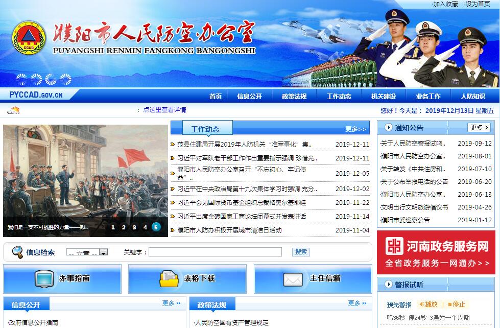 濮阳市人民防空办公室是濮阳市人民政府工作部门,为正处级,统一管理全市人民防空工作。其主要职责是:(一)贯彻执行国家、省人民防空法律、规章和方针政策,拟订全市人民防空政策并监督实施。(二)负责拟订全市人民防空建设规划、城市平战综合防护建设发展规划及相关专项规划并组织实施;参与拟订重要经济目标防护建设总体规划、城市地下空间暨人民防空工程综合利用规划并协同实施。(三)监督管理全市人民防空设施建设、维护和使用。(四)监督指导城市地下空间兼顾人民防空需要防护部分的管理。(五)负责组织开展人民防空执法监管工作。(六)会同有产部门指导开展城市和重要经济目标单位防护工作。组织拟订修订城市人民防空袭方案,指导拟订重要经济目标防护方案,组织开展城市人民防空演训。(七)指导开展人民防空群众组织建设。(八)开展人民防空日常战备工作。(九)组织开展人民防空宣传教育工作。(十)组织开展人民防空科研工作,推进人民防空科技创新和科研成果转化应用推广。(十一)组织实施人民防空信息化体系能力建设。(十二)负责人民防空平战结合工作,利用人民防空战备资源参与抢险救灾、服务民生、改善民生、为应急救援提供支持。战时组织开展城市人民防空行动。(十三)推进人民防空建设与经济社会融合发展。(十四)落实人民防空队伍建设要求,对县(区)人民防空办公室主任、副主任的任免提出意见。(十五)负责依法征缴人民防空工程易地建设费,会同有关部门制定人民防空建设市场投融资政策。(十六)完成市委、市政府及濮阳军分区交办的其他任务。