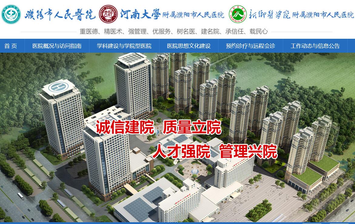 濮阳市人民医院1949年建院,1991年搬迁至现址,是三级甲等综合医院、全国百佳医院,国家医师资格实践技能考试基地、国家住院医师规范化培训基地、河南省全科医生规范化培养基地、河南省博士后创新实践基地,河南大学、河南中医药大学、新乡医学院附属医院和全过程教学基地、硕士研究生培养基地,是十余所高等院校的实习基地。医院占地面积150亩,规划建筑面积20万平方米。开放床位2500张,年门急诊180万人次,出院患者8万多人次,手术3万余台次。现有职工2390余人,专业技术人员占85%以上,其中高级职称310余名,博士、硕士研究生320余名,省市医学会各专业委员200余人,省市级学科带头人、优秀专业技术人才60余人;河南大学、新乡医学院研究生导师20人,大中专院校兼职教师400余人,在院各类学员1500人。医院科室设置齐全,设有18个临床服务部门和6个管理服务部门。学科建设全市领先,河南省医学重点学科4个、重点培育学科8个。医院是河南省创伤救治中心、胸痛中心,濮阳市急救中心、危重孕产妇救治中心、新生儿重症救护中心,濮阳市血液病研究所、濮阳市神经病学研究所、濮阳市皮肤病研究所等均设置在我院。设备配置和服务能力区域领先,拥有PET-CT、西门子3.0T磁共振、飞利浦3.0T磁共振、西门子1.5T磁共振,GE256排CT、西门子SPECT-CT、西门子双源CT、医科达加速器、平板DSA、检验大生化流水线等大型设备80余台件。坚持“建人民满意医院、办百姓放心医院”的宗旨,用钉钉子精神抓落实促发展,医患满意度和社会美誉度持续提升。在国家卫健委组织的满意度调查中,门诊满意度全省第一、住院满意度全省第五、职工满意度全省第六,2012年-2018年连续7年被授予“河南省群众满意医院”称号;在最新医院综合竞争力排名中,居省域第16位,全国地市级医院第152位。
