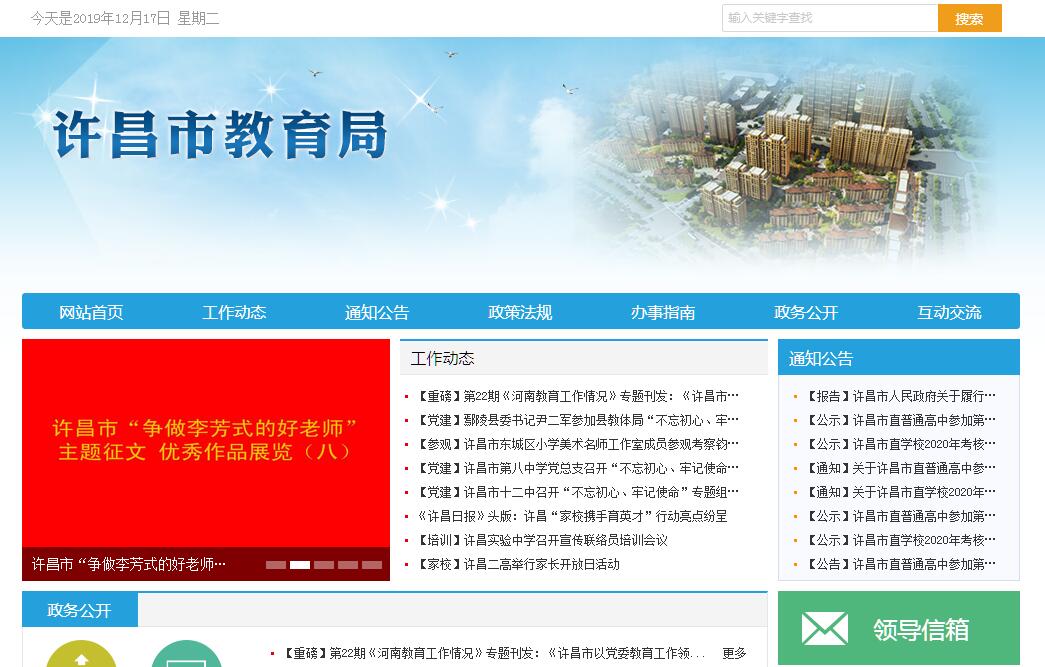 | 网站简介: 许昌市教育局是许昌市政府职能部门,内设办公室、秘书科、发展规划科、财务科等15个科室,7个直属二级机构,主要职责是贯彻执行党和国家教育工作的方针、政策,研究制定教育改革发展规划,统筹管理全市的基础教育、职业教育、成人教育、特殊教育等工作。近年来,市教育局坚持以习近平新时代中国特色社会主义思想为指导,全面贯彻党的十九大精神和教育方针,按照高质量发展根本要求,认真落实省委、市委和上级教育行政部门的决策部署,以办好人民满意教育、打造教育强市为目标,大力实施教育攻坚和改革创新工作,着力破解瓶颈、解难题、促公平、提质量,先后荣获全国“两基”工作、全国职业教育工作、全国未成年人思想道德建设工作先进单位、省级文明单位等荣誉称号。 |