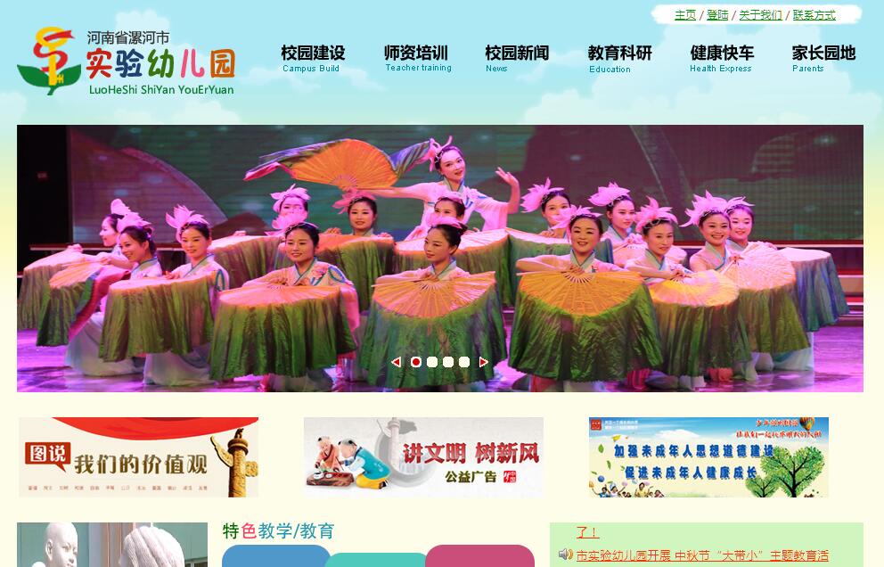 漯河市实验幼儿园位于漯河市沙北行政区,隶属于漯河市教育局,是一所环境优美、设施齐全的省级示范性幼儿园。漯河市实验幼儿园创办于1987年,1988年5月开始招生,现有23个教学班,将近800多名幼儿,教职工109名,其中专业专职教师75人,大专以上学历90%,中学高级教师6人,小学高级教师19人,省级名师6人,省级骨干教师8人,省级文明教师1人,市级骨干教师12人。优质课评比获省级以上奖励18人次,市级以上奖励30人次;辅导幼儿舞蹈绘画获奖达400多人次;教育教学论文在省级以上刊物发表50多篇,获市级以上奖励100多篇。幼儿园另配有保健医3名、专业厨师、电教员、水电工等专职工作人员,以上人员均持有相关部门颁发的专业等级证书。高学历、高能力、高素质的教师队伍成为孩子们探索、发现、学习的支持者、合作者和引导者。漯河市实验幼儿园致力于办园条件的改善,各类设施齐全。班级环境优美温馨、富于童趣;设有音乐活动室、美术活动室、绘本阅读室、多功能厅、图书资料室、会议室等;拥有先进的多媒体教学系统、校园安全监控系统。园内景色怡人、鸟语花香,是孩子们喜爱的美园、乐园、学园。多年来,实幼人凭着对幼儿教育事业的挚爱和开拓创新精神,以严格规范的制度化管理使秩序井然、实干为先;以关爱尊重的人文化管理使快乐工作,快乐生活;以质比天大的标准精细化管理使谋定而动、有效执行;以富于内涵的校园文化建设,营造"和谐共进,爱意浓浓"的青春校园,漯河市实验幼儿园在打造着一支蓬勃朝气、有着凝聚力和向心力的和谐团队。漯河市实验幼儿园多次承担过国家级、省级科研课题,取得了丰硕的成果。目前借鉴多元智能理论和蒙特梭利教育思想,不断进行课程改革。在教育理念上,我们的追求是:开发每个孩子的天赋潜能;开发每个教师的专业潜能;开发每个家长的教育潜能。培养孩子的目标定位在:培养健康睿智、合作独立、自信快乐的儿童。漯河市实验幼儿园以其独特的思考、多元化的教育探索、不断更新的教育理念,一直走在河南幼教行列的最前端,是一所教科研并重、省内外交流广泛、幼教改革领先的现代化幼儿园,在上级关怀和市教育局的正确领导下,漯河市实验幼儿园先后荣获全国“三八”红旗集体、全国优秀家长学校、全国优秀教育科研实验基地、省级示范性幼儿园、省级幼教工作先进集体、省级文明单位、省级文明学校等多项殊荣。