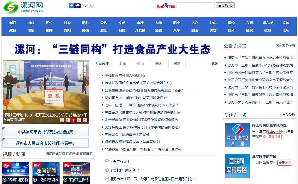 中国·漯河网(www.luohe.com.cn)由隶属于市委宣传部的漯河市互联网新闻中心主办,是继漯河日报、漯河人民广播电台、漯河电视台之后的第四家市属新闻媒体,全市唯一一家重点新闻宣传网站。2003年7月“漯河网”域名成功申请,并被省委宣传部正式审核批准为漯河市重点新闻宣传网站。2004年10月市委宣传部正式把漯河网纳入市属新闻媒体,并称为“三台一报一网络”。漯河网拥有新闻中心、漯河视点、漯河政务、漯河概览、网络参考、摄影网展、许慎文苑、专题专页、网络电视、网络通讯员、市民留言板等多个频道和栏目,建立了临颍、舞阳、源汇、郾城、召陵、高新区6个县区分站,是一个集新闻、信息、互动为一体的本地综合门户网站。漯河网自开通以来漯河网自开通以来,经过数次改版,目前日均发布新闻信息近300多条,日均访问人数达1.5万,日均页面点击量达3万多人次,成为海内外网民认识漯河、了解漯河最快捷、最便利的平台,成为漯河最大最强势的新闻门户网站,成为漯河的第四媒体。“看漯河新闻,点击漯河网”已成为广大网民的共识。漯河网运行以来,市委、市政府的中心工作、漯河市的重大节会活动都做了专题、专页的报道。特别是历届中原食品节,漯河网的全程直播,更是为国内外网民所关注。漯河网每天向新华网、人民网、大河网发送外宣稿件,每年外宣发稿量居全市各媒体发稿量前列。漯河新闻不断被新华网、人民网、新浪网、搜狐网等知名网站转载,新开通的网上电视直播、点播,更是以视频的形式宣传漯河,“漯河”这个名字随着互联网传播越走越远……漯河网将立足漯河、面向全国、放眼世界,着力服务于市委、市政府的中心工作,服务全市改革发展稳定的大局,以创建“互联网络新阵地,文化传播新载体,信息服务新平台”为目标,积极拓展服务领域,全面提高服务质量,不断扩大网站社会影响力,努力建成“省内一流、全国知名”的综合网站,为我市“两大名城”建设,为漯河在中原城市群中快速隆起营造良好的网上舆论氛围,提供有力的宣传支持。漯河网,我们共同的网上家园!