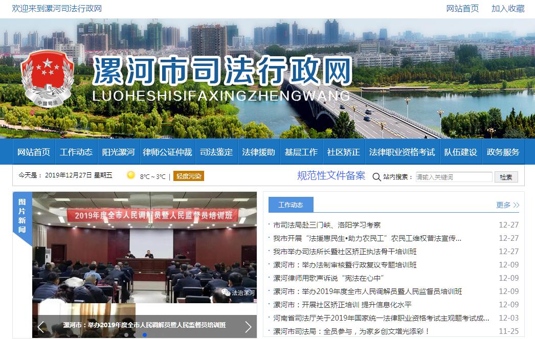 2018年12月,机构改革重新组建漯河市司法局。将市司法局和市政府法制办公室的职责整合,重新组建漯河市司法局,作为市政府工作部门。其主要职责是:1、贯彻执行党和国家及省司法行政工作的方针政策和法律法规,研究拟定全市司法行政工作的措施,编制司法行政工作中长期规划、年度计划并组织实施。2、制定全市法制宣传教育和普法依法治理工作规划并组织实施;制定全市法学成人教育规划、年度计划;指导全市对外法制宣传工作。3、管理和指导全市的律师、法律顾问、法律援助工作;组织制定全市律师工作发展规划以及律师管理的有关办法;管理全市社会法律咨询服务机构及在我市设立的外地律师机构。4、制定全市公证改革与发展的总体规划并组织实施;管理和指导公证机构,负责公证业务质量的监督检查,负责审查涉外、涉港澳台公证事务。5、制定全市人民调解工作总体规划并组织实施;指导各县(市、区)司法行政机关人民调解工作和基层法律服务工作,参与社会治安综合治理。6、指导对刑满释放人员和解除劳动教养人员的过渡性安置帮教工作;负责全市刑满释放人员和解除劳动教养人员安置帮教工作的统计、分析、上报。7、管理和指导面向社会服务的司法鉴定工作;按照有关规定,负责司法鉴定机构设立登记的初审和上报。8、负责仲裁机构的审核、申报工作。9、管理全市司法行政系统的协会和学会;管理和指导全市的法学理论研究;制定全市法学教育和司法行政干警培训规划及企业法律顾问培训规划。10、协调和指导全市“148”法律服务专线工作,受理群众寻求法律服务事宜;解答法律咨询,普及法律知识;掌握重大民间纠纷信息,提供决策依据和信息服务。11、承办市政府交办的其他事项。