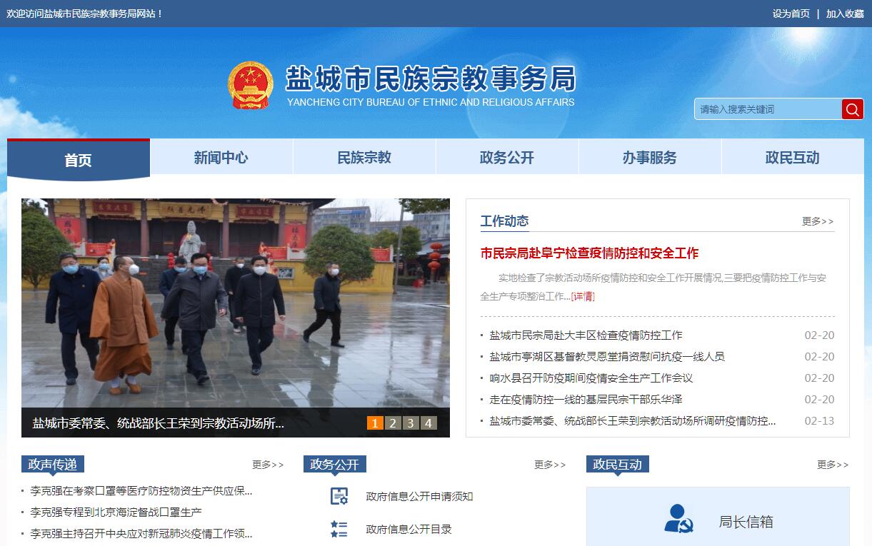 盐城市民族宗教事务局主要职责:(一)贯彻执行党中央、国务院关于民族宗教工作的方针、政策和有关法律法规及规章制度,组织开展民族宗教理论、政策和工作重大问题的调查研究,提出有关政策建议。(二)拟订我市民族宗教工作方面的政策规定和相关文件,并组织实施。承担民族宗教事务行政审批、行政复议和行政诉讼工作。组织协调网络宗教事务管理,规范网络宗教信息服务。协调推动有关部门履行民族宗教工作相关职责。(三)贯彻落实中央、省、市少数民族事业等专项规划,监督检查规划实施情况,推进实施民族宗教事务服务体系和民族宗教事务管理信息化服务。(四)会同有关部门监督少数民族专项资金使用,参与少数民族扶贫工作。协助有关部门发展少数民族聚居地经济、社会事业。(五)协助有关部门加强对生产销售清真食品的扶持和管理,落实少数民族特需商品的生产和供应工作,参与边疆民族地区的经济技术合作、对口支援工作。(六)依法保护全市少数民族公民的合法权益;组织和承办民族团结进步表彰活动;协助有关部门培养选拔少数民族干部; (七)依法保护公民宗教信仰自由。(八)指导宗教团体依法依章开展活动,引导各宗教坚持中国化方向,支持宗教团体加强自身建设,推动宗教团体在宗教界开展爱国主义、社会主义、拥护祖国统一和民族团结的自我教育,办理宗教团体需由政府解决和协调的有关事务。(九)依法履行宗教事务管理职责,依法处理民族宗教事务的重大事项。防范利用宗教进行的非法、违法活动,抵御境外利用宗教进行的渗透活动。(十)负责宗教方面的对外交流归口管理工作,组织指导全市对外以及对港澳台的宗教交往活动。(十一)指导县(市、区)相关民族宗教工作。(十二)完成上级民族宗教部门委托(授权)和市委市政府、市委统战部交办的其他任务。
