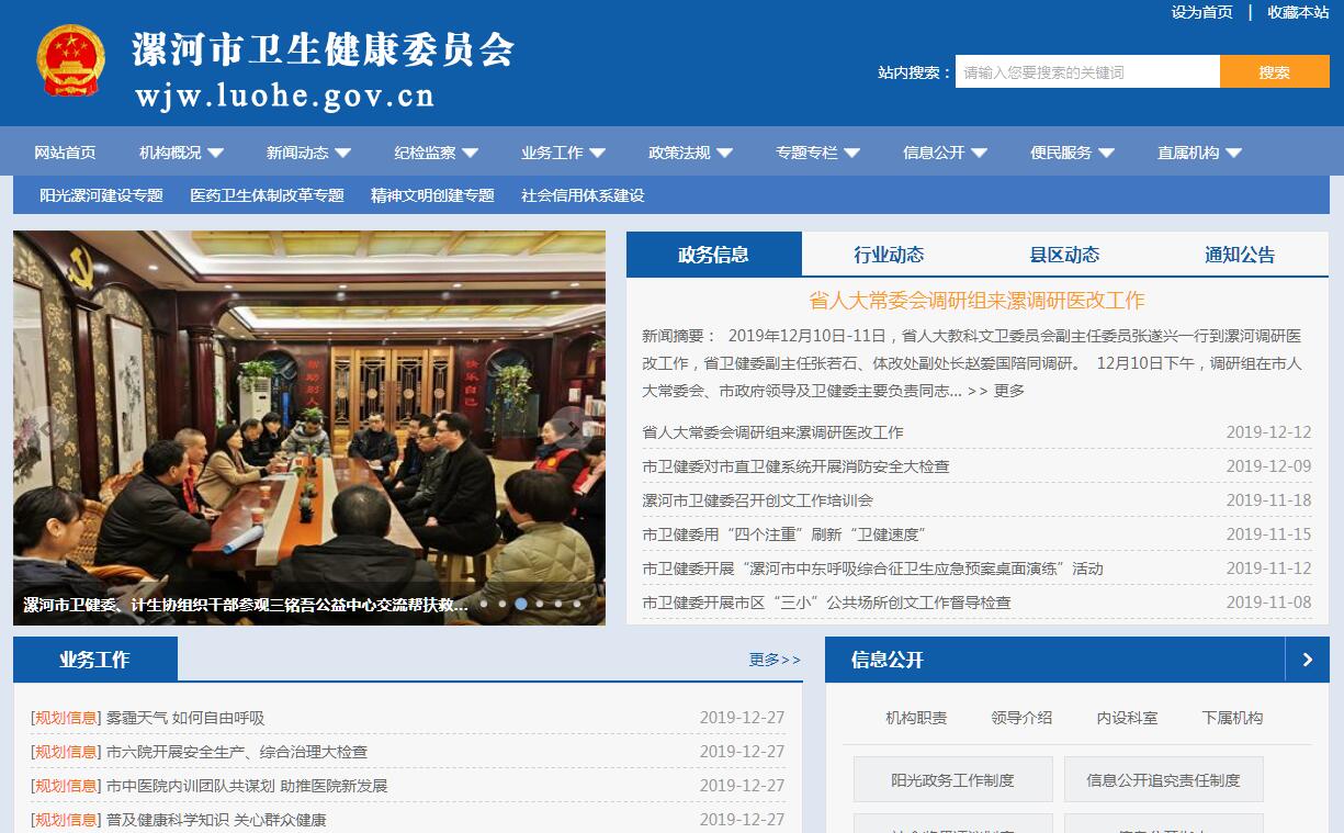 漯河市卫生健康委员会主要职责:(一)贯彻执行国家、省卫生健康事业发展法律法规、政策、规划,负责起草全市卫生健康、中医药事业发展的政策意见、规划和规章草案。统筹规划全市卫生健康资源配置,指导全市区域卫生健康规划编制和实施。拟订推进全市卫生健康基本公共服务均等化、普惠化、便捷化和公共资源向基层延伸等政策措施并组织实施。(二)协调推进深化医药卫生体制改革,研究提出全市深化医药卫生体制改革重大政策、措施的建议。组织深化公立医院综合改革,推进管办分离,健全现代医药医院管理制度,组织实施国家及省推动卫生健康公共服务提供主体多元化、提供方式多样化的政策措施,提出医疗服务和药品价格政策的建议。(三)拟订并组织落实全市疾病预防控制规划、免疫规划以及严重危害人民健康公共卫生问题的干预措施。负责卫生健康系统安全管理工作和卫生应急工作,组织指导突发公共卫生事件的预防控制和各类突发公共事件的医疗卫生救援。根据授权发布法定报告传染病疫情信息、突发公共卫生事件应急处置信息。(四)拟订并协调落实应对人口老龄化政策措施,负责推进老年健康服务体系建设和医养结合工作。(五)贯彻落实国家药物政策和国家基本药物制度,开展药品使用监测、临床综合评价和短缺药品预警。组织开展食品安全风险监测评估,贯彻执行食品安全地方标准,依法开展食品安全企业标准备案工作,为食源性疾病及与食品安全事故有关的流行病学调查提供技术支持。(六)负责职责范围内的职业卫生、放射卫生、环境卫生、学校卫生、公共场所卫生、饮用水卫生等公共卫生的监督管理,负责传染病防治监督,健全卫生健康综合监督体系。(七)拟订全市医疗机构、医疗服务行业、采供血机构管理办法并监督实施,建立医疗服务评价和监督管理体系。会同有关部门贯彻执行国家卫生健康专业技术人员资格标准。拟订医疗服务规范、标准和卫生健康专业技术人员执业规则、服务规范并组织实施。(八)负责计划生育管理和服务工作,开展人口监测预警,研究提出人口与家庭发展相关政策建议,贯彻落实计划生育政策。(九)指导基层医疗卫生、妇幼健康服务体系建设,加强全科医生队伍建设。推进卫生健康科技创新发展。(十)负责市保健对象的医疗保健工作,负责重要会议与重大活动的医疗卫生保障工作。(十一)负责中医管理工作,拟订全市中医药事业中长期发展规划。(十二)承担市爱国卫生运动委员会日常工作,市爱国卫生运动委员会办公室设在市卫生健康委员会。(十三)承担市艾滋病防治工作委员会、市老龄工作委员会、市人口和计划生育工作领导小组、市保健委员会日常工作,指导漯河市计划生育协会业务工作。(十四)完成市委、市政府交办的其他任务。
