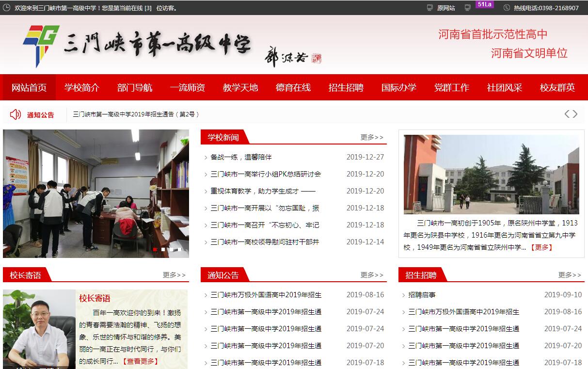 三门峡市一高初创于1905年,原名陕州中学堂,1913年更名为陕县中学校(县立),1916年更名为河南省立第九中学校,1949年9月更名为河南省立陕州中学,1953年更名为陕县高级中学,1957年成立三门峡市,1959年11月撤销陕县建制,陕县并入三门峡市,此时陕县高级中学更名为三门峡市第一高级中学,1959年文化巨匠郭沫若亲笔为一高题写了校名,1969年1月文革期间学校停办,1981年三门峡市委市政府决定在建设路中段12号复建三门峡市第一高级中学,至此,终断13年的三门峡市第一高级中学又恢复办学,承袭至今,学校历经百年沧桑,文化底蕴丰厚。目前拥有教工253人,在校生近3000人,共设54个教学班。学校占地面积80余亩。三门峡市一高多年来全面加强全体教工敬业爱岗教育,通过名师引领、师徒结对、课题研究、论文论著撰写评选、校本培训与课程研发、强势学科组建设、师德征文与演讲、班主任比武等多种途径,形成了一支师德高尚、师技精湛、结构合理的优秀师资队伍。在职高级教师77人,特级教师、享受国务院津贴的国家级专家、省管优秀专家、国家级省市级骨干教师、教学名师、省级拔尖人才、学术技术带头人等百余人,教师结构合理,教学经验丰富。多年来,三门峡市一高高考本科上线率始终名列全市前茅,李新峰、陈潇、边春、张哲、郝铮等先后获得全市高考状元,考入清华大学、北京大学等名牌院校10余人,魏维、崔微微等20余人保送进入北京师范大学、中国青年政治学院、华南理工大学、西北农林科技大学,取得了良好的办学效益和社会效益。学校被国家教育部命名为校园网建设示范单位,被河南省委省政府第五次命名为省级文明单位,被省教育厅命名为河南省首批示范性高中,并获得了省级优秀学校、省级绿色学校、省级安全文明校园、省级办学规范化先进单位和市级教育教学嘉奖单位等多项荣誉称号。