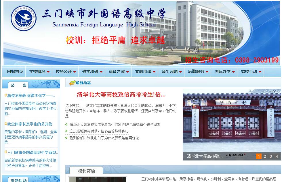 三门峡市外国语高中创建于2010年。学校位于三门峡市经济开发区北环路以西,陕州风景区东北侧,北依黄河,总占地面积180.54亩,规划建设用地169.14亩,建筑面积9.2万平方米,设计规模为4500人,90个教学班。学校现有教职工222人,均具有大学本科以上学历,学历达标率100%。其中研究生学历50人,高级教师47人,获得省级学科大奖的38人,三名海外留学生,两名外籍教师。学校硬件设施均按照“人本、超前、实用、一流”的原则配备。目前,学校拥有物理实验室4个、化学实验室4个、生物实验室2个、微机室2个,通用技术实验室2个。图书室、阅览室2个,藏书五万余册。学生公寓每室均配备空调、壁柜、饮水机、独立卫生间,冬季集中供暖,全天供应热水。四个餐厅可容5000余人同时就餐。室内体育馆面积3000平米,室外体育场设有400米的塑胶跑道、天然草坪足球场、8个标准塑胶篮球场和4个标准塑胶排球场,均通过“亚洲田径联赛”认证。学校教育特色鲜明。教学方面主要体现在外语教学突出、注重校本课程的开发与教学、体音美实行分项教学等。管理方面实行小红帽、小橘帽学生自治管理,辅以导师制全程陪伴成长。鼓励学生积极组织各种有益活动,现在学校已有学生自发组织的绿橄榄外语社、萱瑞堂文学社、x-power街舞社、雷雨话剧社等13个社团。学校秉承“拒绝平庸,追求卓越”的校训,本着“人本、高效、和谐、幸福”的理念,发扬“厚德、博学、协作、超越”的教风,光大“勤学、乐学、善学、笃学”的学风,自强不息,励志笃行。办学之初便在全市各种考核中脱颖而出,2010年至今,先后获得“河南省校本教研示范校”“三门峡市示范性高中”“目标完成优秀单位”“三门峡市文明单位”“三门峡市绿色学校”“三门峡市园林单位”“三门峡市社会综合治理先进单位”等。