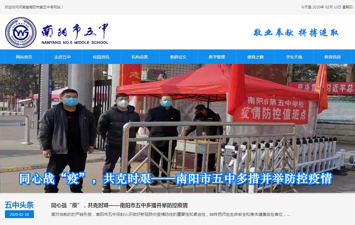 南阳市第五中学校,位于风景秀丽的白河南岸,淯水之滨。学校前身为南阳县第一高级中学,创建于1980年,1994年11月南阳撤地改市后,更名为南阳市第五中学校,是市教育局直属的省级示范性普通高中。学校在河南省率先通过了IS09001:200国际质量体系认证,是豫西南唯一的一所经省教育厅批准具有招收“宏志班”资格的学校。学校占地120亩,建筑面积5.69万平方米,有综合楼、报告厅和学生餐厅、学生公寓、博学楼、笃行楼等建筑群;有藏书十万余册的图书馆;有塑胶田径场、灯光塑胶篮排球场和高标准的人工草坪足球场;有现代化的录播教室、心理咨询室和多媒体教室。校园环境优美,文化氛围浓厚。学校现有学生9000余人,116个教学班。在岗教职工500余名,具有高级教师资格141名,研究生学历160名,国家级骨干教师9名,省级学术技术带头人32名,市级以上学科带头人、骨干教师138名。自办学以来,共为全国各类高校输送三万余名优秀学生,每年都有一大批优秀学子考入清华、北大等国家重点院校。尤其从2014年以来,四年四大步,年均增长超百人,尤其2017年一本上线1040人,二本上线2476人,升学人数又创新高。连续多年受到市政府记功嘉奖,并被评为教育教学先进单位。近年来学校还获得了“河南省文明单位”、“河南省普通高中课程改革先进单位”、“河南省中小学师德师风先进单位”、“河南省教育信息化应用示范校”、“首批国家级教育信息化试点学校”、“全国青少年校园足球特色学校”等一系列荣誉称号。