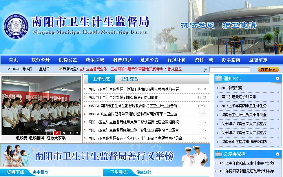 | 网站简介: 南阳市卫生监督局于2005年经市编办批准成立,正科级全供事业单位,人员工资待遇参照公务员管理,2012年12月20日,经市编办批复同意,有南阳市卫生监督所更名为南阳市卫生监督局。承担职能如下:一、依法监督医疗机构、采供血机构、放射诊疗机构及从业人员的依法执业活动,打击非法行医和非法采供血行为;依法监督传染病防治工作;二、依法承担生活饮用水、涉水产品和消毒产品卫生安全监督工作;三、依法承担公共场所卫生、学校卫生监督工作;四、依法承担食品安全、餐饮具及公共用品等集中消毒服务机构、职业病健康体检及诊断机构卫生监督工作;五、依法承担公共场所、供水单位、放射诊疗机构等的卫生许可证的初审、现场审核工作;六、依法承担对下级卫生监督执法机构的稽查指导工作;七、负责受理、核实和查处对卫生相关违法行为的投诉、举报,承担对卫生行政处罚案件的调查取证、提出处罚建议和执行处罚决定。南阳市卫生监督局秉承“执法为民,护卫健康”执法宗旨,严厉打击各种违法行为,护卫人民群众身体健康和生命安全。协调和指导各区县卫生监督机构查处重大违法案件和跨区县违法案件。 |
