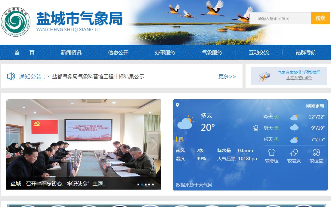 盐城气象事业始于抗战前,曾先后在东台、阜宁等县设立测侯所多处,1958年成立了江苏盐城专区气象台。1983年,随着盐城市的建立,正式更名为盐城市气象局。流金岁月半世纪,经过几代气象人的不懈努力,开创了盐城气象的新辉煌。全市下辖九个县(市、区)气象局,现有正式职工156人,高级工程师8人,工程师82人,大专以上学历职工98人,硕士研究生6人。市局设有办公室、人事处、业务处、法规处、财务结算中心,下属单位七个:执法支队、气象台、专业台、民航台、防雷中心、网络中心、图审中心。台站业务:中、长、短期、短时天气预报,农业气象预报服务,民航气象预报服务,海洋气象预报服务,专业气象服务,影视天气预报发布制作,地面测报,高空测报,雷达气象探测,航危报,人工局部影响天气,防雷工程设计安装,避雷设施检测。盐城市气象局主要职责:1、负责本行政区域内气象事业发展规划、计划的制定及气象业务建设的组织实施;负责本行政区域内气象设施建设项目的审核;对本行政区域内的气象活动进行指导、监督和行业管理。2、组织管理本行政区域内气象探测资料的汇总、传输;依法保护气象探测环境。3、负责本行政区域内的气象监测、预报管理工作,及时提出气象灾害防御措施,并对重大气象灾害作出评估,为本级人民政府组织防御气象灾害提供决策依据;管理本行政区域内公众气象预报、灾害性天气警报以及农业气象预报、城市环境气象预报、火险气象等级预报等专业气象预报的发布。4、管理本行政区域人工影响天气工作,指导和组织人工影响天气作业;组织管理雷电灾害防御工作,会同有关部门指导对可能遭受袭击的建筑物、构筑物和其它设施安装的雷电灾害防护装置的检测工作。5、负责向本级人民政府和同级有关部门提出利用、保护气候资源和推广应用气候资源区划等成果的建议;组织对气候资源开发利用项目进行气候可行性论证。6、组织开展气象法制宣传教育,负责监督有关气象法规的实施,对违反《中华人民共和国气象法》有关规定的行为依法进行处罚,承担有关行政复议和行政诉讼。7、统一领导和管理本行政区域内气象部门的计划财务、人事劳动、科研和培训以及业务建设等工作;会同县(市)人民政府对县(市)气象机构实施以部门为主的双重管理;协助地方党委和人民政府做好当地气象部门的精神文明建设和思想政治工作。8、承担上级气象主管机构和本级人民政府交办的其它事项。