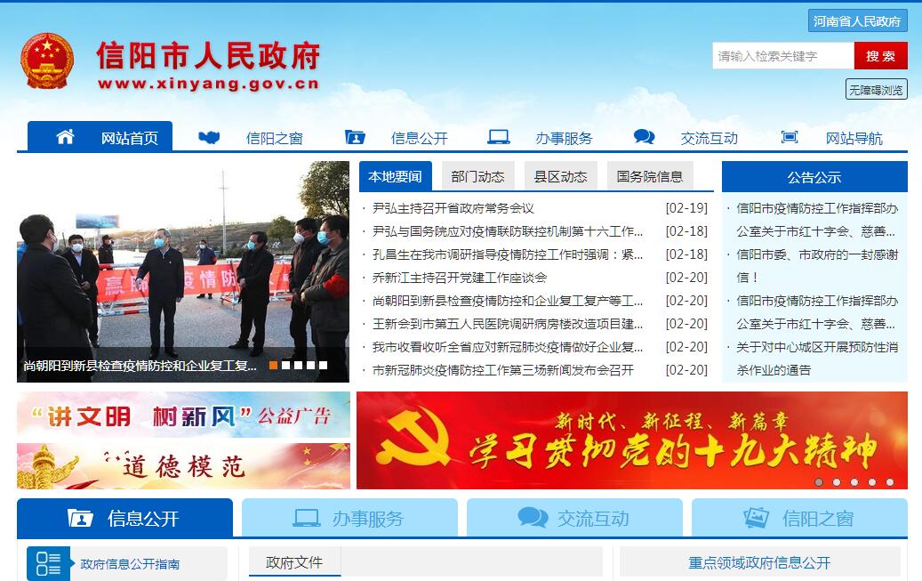 信阳,古称义阳、申州,又名申城,河南省地级市,地处河南省最南部、淮河上游,东连安徽省,南通湖北省,为三省通衢,是江淮河汉之间的战略要地,也是中国南北地理、气候、文化的过渡带。信阳处于中原城市群、武汉城市圈、皖江城市带三个国家级经济增长板块结合部和京广、京九“两纵”经济带的腹地,中西部人口密集区的中间位置。截至2018年,信阳总面积1.89万平方公里,常住人口647.41万,辖8县2区及6个管理区、开发区。信阳山清水秀,气候宜人,有“江南北国、北国江南”之美誉。信阳有着豫风楚韵的地域文化,楚文化与中原文化在这里交融,形成了信阳独特的人文环境。信阳是孙叔敖、息夫人、春申君、司马光、郑成功等历史名人的故乡,孔子周游列国的终点,春秋时孙武在此练兵并南下攻入楚都,南朝时梁武帝萧衍发迹于信阳。信阳毛尖闻名遐迩,被誉为山水茶都、中国毛尖之都。荣获国家森林城市、国家级生态示范市、全国绿化模范城市、中国宜居城市、中国优秀旅游城市、国家园林城市、中国最具幸福感城市等头衔。2015年6月5日,涉及鄂豫皖三省、信阳市全境的《大别山革命老区振兴发展规划》正式获批实施。信阳作为此次规划的核心区域和明确支持发展的重点区。2018年10月18日,《国务院关于淮河生态经济带发展规划的批复》发布。涉及信阳市全境的淮河生态经济带上升为国家战略,信阳作为三大核心城市之一。2017年12月,获得“厕所革命优秀城市奖”。