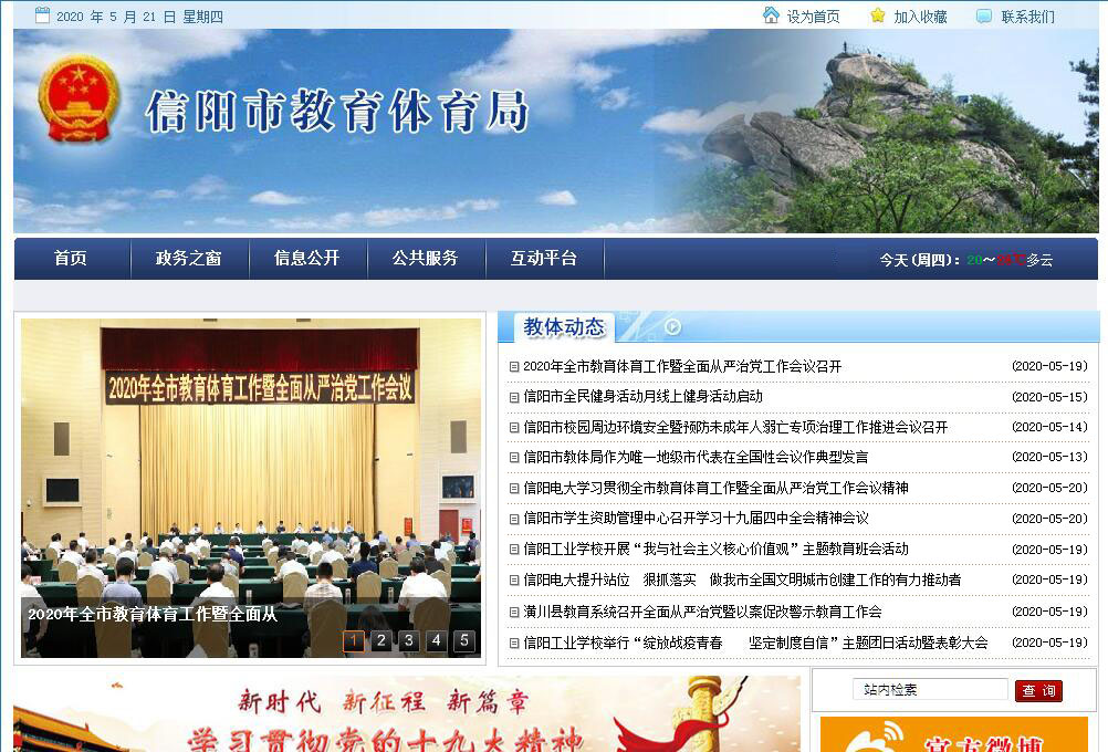 信阳市教育体育局贯彻落实党中央关于教育体育工作的方针政策和决策部署,在履行职责过程中坚持和加强党对教育体育工作的集中统一领导。其主要职责是:(一)贯彻执行党和国家关于教育体育工作的法律、法规及方针政策,研究拟订全市教育体育工作规范性文件并监督实施;负责教育体育理论研究和宣传工作。(二)研究提出在全市教育系统坚持党的领导、加强党的建设政策措施并组织实施;统筹全市教育工作的总体布局并负责协调推进和督促落实。(三)负责全市各级各类教育体育的统筹规划和协调管理;拟订全市教育体育改革发展战略和教育体育事业发展规划;指导各级各类学校的教育教学改革;负责全市教育体育基本信息的统计、分析和发布;推进全市公共体育、多元化体育服务体系建设。(四)负责本部门教育体育经费的统筹管理,参与拟订教育体育经费筹措、拨款、基建投资的政策;负责统计全市教育体育经费投入情况和教育体育系统内部审计工作及学生资助工作。(五)负责推进全市义务教育均衡发展和促进教育公平,负责义务教育的宏观指导与协调;指导普通高中教育、学前教育和特殊教育工作;落实基础教育教学基本要求和教学基本文件,全面实施素质教育;指导全市教育督导工作组织对全市学校和其他教育机构、义务教育均衡发展的督导检查和评估验收工作;负责基础教育发展水平、质量的监测工作。(六)负责全市中等职业教育、成人教育工作。指导以就业为导向的职业教育的发展与改革,落实中等职业教育专业目录、教学指导文件和教学评估标准。(七)负责民办教育的综合协调工作,拟订民办教育发展规划、政策措施和规范性文件。(八)拟订全市中等学校招生计划及招生考试政策;指导中等职业学校开展毕业生就业创业工作。(九)负责全市教育系统思想政治、意识形态工作,指导各级各类学校的德育、体育、卫生、艺术教育、劳动教育及国防教育工作;指导全市教育系统落实好党的民族宗教政策;负责教育系统安全稳定与信访工作。(十)主管全市教师工作。负责全市各级各类教育资格制度实施;归口管理教师和教育管理人员继续教育;配合有关部门研究提出各级各类学校编制标准;指导各级各类学校内部人事与分配制度改革;指导全市教育体育系统人才队伍建设;负责教育体育的表彰奖励。(十一)负责全市普通高等学校、中等专业学校、成人高等学校的招生考试工作;管理全市教育体育系统的科研工作;指导全市教育体育系统信息化建设工作。(十二)负责协调全市学校治安综合治理和安全管理工作;承担协调、指导检查、督促全市教育体育系统信访稳定工作。(十三)推进全民健身计划,指导开展群众性体育活动实施国家体育锻炼标准,开展国民体质监测;指导公共体育设施建设,负责公共体育设施的监督管理。(十四)统筹规划全市竞技体育发展和体育运动项目设置与重点项目布局;负责市运动队伍建设和体育后备人才培养,贯彻落实等级运动员和等级裁判员制度;组织开展体育运动中的反兴奋剂工作。(十五)组织举办全市综合性运动会,统筹规划全市青少年体育发展,指导和推进青少年体育工作。(十六)组织指导全市教育体育方面对外交流与合作,组织参加和承办省内外体育竞赛。(十七)拟订全市体育产业政策,规范体育产业发展,制定体育经营活动从业条件和监督管理程序,促进体育市场发展,指导监督体育彩票的销售工作。(十八)承办市委、市政府交办的其他事项。