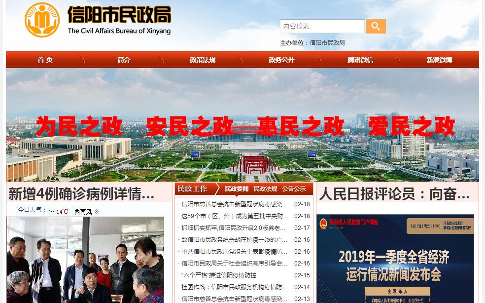 信阳市民政局贯彻落实党中央关于民政工作的方针政策和决策部署,在履行职责过程中坚持和加强党对民政工作的集中统一领导。其主要职责是:(一)贯彻落实民政工作法律、法规,拟订全市民政事业发展规划和政策,起草有关民政工作的规范性文件和标准并组织实施。(二)拟定全市社会团体、社会服务机构等社会组织登记和监督管理办法并组织实施,依法对社会组织进行登记管理和执法监督。(三)拟订全市社会救助政策、标准,健全城乡社会救助体系,负责城乡居民最低生活保障、特困人员救助供养、临时救助、生活无着流浪乞讨人员救助工作。(四)拟订全市城乡基层群众自治建设和社区治理政策,指导城乡社区治理体系和治理能力建设,提出加强和改进城乡基层政权建设的建议,推动基层民主政治建设。(五)拟订全市行政区划管理政策和行政区域界线、地名管理办法,负责全市乡镇街道办事处的设立、命名、变更和政府驻地迁移的审核报批工作,负责跨县区重要自然地理实体的命名、更名的审核工作,负责全市行政区域界线的勘定、管理和地名管理服务工作。(六)拟订全市婚姻管理政策并组织实施,承担全市涉港、澳、台地区的婚姻登记工作,推进婚俗改革。(七)拟订全市殡葬管理政策、服务规范并组织实施,推进殡葬改革。(八)协调推进、督促指导、监督管理全市养老服务工作,拟订全市养老服务体系建设规划、政策、标准并组织实施,承担老年人福利和特殊困难老年人救助工作。(九)拟订全市残疾人权益保护政策,协调推进残疾人福利制度建设和康复辅助器具产业发展。(十)拟订全市儿童福利、孤弃儿童保障、儿童收养、儿童救助保护政策、标准,健全农村留守儿童关爱服务体系和困境儿童保障制度。(十一)组织拟订全市促进慈善事业发展政策,指导社会捐助工作,负责福利彩票销售管理工作。(十二)拟订全市社会工作、志愿服务政策和标准,会同有关部门推进社会工作人才队伍建设和志愿者队伍建设。(十三)完成市委、市政府交办的其他任务。