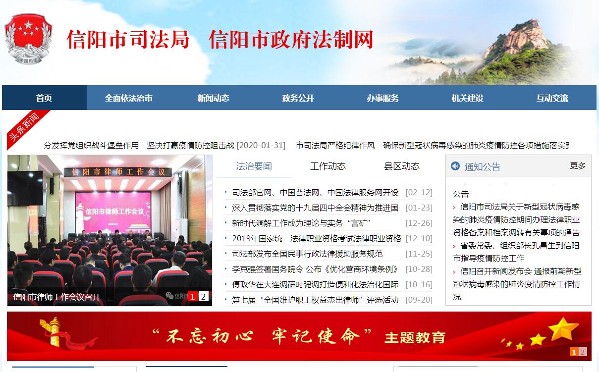 信阳市司法局主要职能:(一)承担全面依法治市重大问题的政策研究,协调有关方面提出全面依法治市中长期规划建议,负责有关重大决策部署督察工作。(二)承担统筹规划立法工作。协调有关方面提出立法规划和年度立法工作计划建议。负责跟踪了解各部门对立法工作计划的落实情况,加强组织协调和督促指导,研究提出立法与改革决策相衔接的意见、措施。负责面向社会征集地方性法规、规章制定项目建议。(三)承担有关重要的、综合性的地方性法规、规章草案起草或者组织起草工作。负责对与群众利益密切相关的地方性法规、规章草案面向社会公开征求意见。负责审查报送市政府的地方性法规、规章草案,向市政府报告审查、修改意见。负责立法协调工作。(四)承担市政府规章向国务院、省政府和市人大常委会备案工作。承担县区政府和市政府各部门规范性文件备案审查工作。负责市政府规章的立法解释、立法后评估工作。负责市政府规章、规范性文件的清理编纂工作;组织指导全市规范性文件清理工作。(五)承担统筹推进法治政府建设工作。负责推进全市依法行政、建设法治政府方面的统筹规划、综合协调、督促指导、考核评价工作。指导监督各县区政府、市政府各部门依法行政工作。(六)承担综合协调、指导监督全市行政执法工作。研究完善规范行政执法有关制度,推进严格规范公正文明执法。负责推进服务型行政执法建设,全面落实行政执法责任制。承担推进行政执法体制改革有关工作。负责全市行政执法主体和行政执法人员资格管理。负责指导行政裁决工作。(七)承担市政府交办的法律事务。负责市政府涉法重大决策和重要事务合法性审查,负责对以市政府名义制发的重要规范性文件的合法性审查。推进全市法律顾问工作。(八)承担统筹规划法治社会建设工作。负责拟订全市法治宣传教育规划,组织实施普法宣传工作。推动人民参与和促进法治建设。指导全市依法治理和法治创建工作。指导全市人民调解、行政调解、行业性专业性调解工作和人民陪审员、人民监督员选任管理工作。推进司法所建设。(九)负责拟订全市公共法律服务体系建设规划并指导实施。统筹和布局全市城乡、区域法律服务资源。指导监督全市律师、法律援助、司法鉴定、公证、仲裁和基层法律服务管理工作。(十)负责全市国家统一法律职业资格考试组织实施工作。负责全市统一法律职业资格和证书管理工作。负责规划和指导全市法律职业人员入职前培训工作。(十一)负责市监狱管理工作。监督管理市监狱刑罚执行、罪犯改造、重要设施建设等工作。指导、管理全市社区矫正工作,指导社会力量和志愿者参与社区矫正工作。指导刑满释放人员帮教安置工作。(十二)负责全市司法行政系统强制隔离戒毒场所和戒毒康复场所管理工作。指导监督全市司法行政系统强制隔离戒毒措施执行和戒毒康复工作。对社区戒毒和社区康复工作提供指导、支持和协助。(十三)指导监督全市司法行政系统财务、装备、设施、场所建设等保障工作。负责全市司法行政系统警务装备的管理工作。(十四)指导监督全市司法行政系统队伍建设。负责全市司法行政系统警务管理和警务督察工作。协助县区管理司法局领导干部。(十五)完成市委、市政府交办的其他任务。