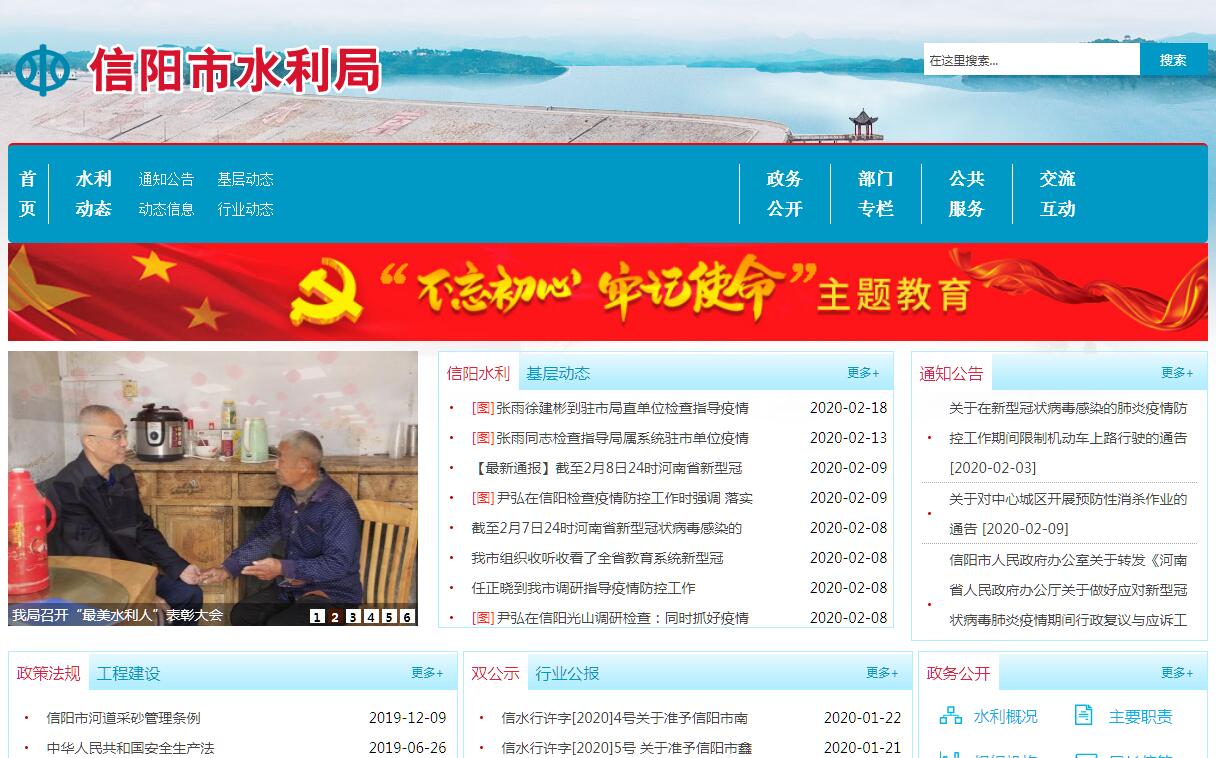 信阳市水利局主要职责:(一)拟定全市水利工作的有关政策、发展战略和中长期规划;负责《水法》、《水土保持法》、《防洪法》、《渔业法》等法律法规的实施和水行政复议。(二)统一管理全市水资源(含空中水、地表水、地下水)。组织制订全市及跨县区中长期水供求计划、水量分配方案并监督实施;组织有关全市国民经济总体规划、城市规划及重大建设项目的水资源和防洪的论证工作;组织实施取水许可制度和水资源费征收制度;直接对信阳市城市规划区地下水和法定取水大户征收水资源费。发布全市水资源公报。(三)拟定全市节约用水政策、制订用水计划、编制节约用水规划、制定有关标准,负责征收超计划用水加价水费,负责推广使用节水设施,组织、管理和监督节约用水工作。(四)按照国家和省资源环境与保护的有关法律、法规和标准,拟定全市水资源保持规划;划定水域使用功能区及其水质保护标准,监测河流湖库的水量、水质,确定水域纳污能力,审查入河排污口的设置,提出水域的限制排污总量意见。(五)组织实施、指导全市水政监察和水行政执法;协调并处理部门间和县区间的水事纠纷。(六)配合有关部门制定全市水利行业的经济调节措施;对水利资金的使用进行宏观调节;指导水利行业的供水、水电、水域开发利用及多种经营工作;研究提出有关全市水利的价格、税收、信贷、财务等经济调节意见。(七)编制、审查、上报全市各类水利基本建设项目建议书、可行性研究报告和初步设计;组织水利科学研究和技术推广;组织实施水利行业技术质量标准和水利工程规程、规范。(八)组织、指导全市水利设施、水域及其岸线的管理和保护;组织指导河流湖库及滩地的治理开发;组织建设和管理具有控制性的或跨县区的重要水利工程;组织、指导水库、水电站大坝的安全监管;负责河道砂石开采的规划和管理。(九)负责全市农村水利工作;组织协调农田水利基本建设和乡镇供水、人畜饮水工作;参与指导农村水电电气化建设。(十)负责全市水土保持工作,研究制定水土保持规划,组织水土流失的监测和综合防治。(十一)负责全市水产工作和渔政执法管理工作。(十二)组织指导全市水利科技、教育工作,指导和管理全市水利队伍建设。(十三)承担市防汛抗旱指挥部的日常工作,组织、协调、监督、指导全市防洪抗旱工作,对主要河流及重要水利工程实施防汛抗旱调度。(十四)编制水利工程移民规划、计划;组织指导移民般迁、安置和后期生产扶持工作;管理和监督移民资金的使用。(十五)承办市政府交办的其他事项。