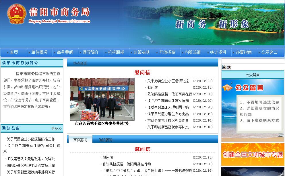 信阳市商务局贯彻落实党中央关于商务工作的方针政策和决策部署,在履行职责过程中坚持和加强党对商务工作的集中统一领导。其主要职责是:(一)贯彻落实国家、省有关国内外贸易和国际、国内经济合作方面的法律法规和方针政策。(二)统筹协调、归口管理全市对外开放、商贸流通、对外贸易、国际经济技术合作和电子商务等工作,拟订并组织实施相关发展规划和政策措施,深化商务领域改革。(三)负责全市对外开放的宏观指导和组织协调,研究推进开放带动主战略实施的长效机制;督促检査对外开放政策措施的落实情况,协调解决对外开放工作中出现的重大问题。(四)负责全市商务系统涉及世界贸易组织相关事务的研究、指导和服务工作;组织协调反倾销、反补贴和保障措施及其他与进出口公平贸易相关工作;建立进出口公平贸易预警机制,组织产业损害调查,指导协调产业安全应对工作。(五)贯例落实国家、省关于商务领城市场秩序的政策;负责全市商务领域诚信体系建设;负责督导全市商务领域监督执法和举报投诉服务体系建设及管理工作;负责贯彻落实国家、省药品流通发展规划、政策和相关标准,推进药品流通行业结枃调整,指导药品流通企业改革。(六)负责全市市场体系建设工作,促进城乡市场体系建设和发展;负责统筹拟订全市流通产业发展促进政策及行业标准,协调推进全市流通领域法规体系建设,推进全市流通产业发展;牵头协调推进全市物流业转型发展工作。(七)组织实施全市重要消费品市场调控、重要生产资料流通管理工作,负责建立健全生活必需品市场供应应急管理机制,监测分析市场运行、商品供求状况;按照分工负责重要消费品(不含食糖)储备管理和市场调控工作;依法对有关特殊流通行业进行监督管理;按有关规定对成品油流通进行管理。(八)负责全市商品进出口管理工作,执行国家对外贸易、进出口管制以及鼓励技术和成套设备进出口政策;依法监督全市技术引进、国家限制出口技术工作;组织实施重要工业品、原材料和重要农产品进出口总量计划;牵头负责全市外贸转型升级基地建设工作,指导贸易促进活动和外贸促进体系建设。(九)拟订全市服务业、服务贸易发展政策并组织实施;会同有关部门拟订全市促进服务进出口和服务外包发展的规划、政策并组织实施,指导服务外包平台建设;依规对全市举办的经贸交流活动(含博览会、展销会、交易会和国际性会议等)进行管理,依规对市内举办的涉外经济技术展览会进行监管;负责商贸服务业行业管理工作。(十)拟订全市外商投资政策并组织实施;依法对外商投资事项进行监督管理;统筹规范对外招商引资活动;会同有关部门抓好投资环境治理工作,协调解决外商投资企业运行过程中的问题,依法受理、处理境内外投资者的建议和投诉等。(十一)牵头负责国内经济技术合作和区域性经贸交流活动;负责境内招商引资及统计工作;负责外地驻信经贸机构备案管理工作,指导联系外地驻信和驻外地商协会等社会组织工作。(十二)拟订全市对外经济技术合作政策并组织实施,依法管理和监督全市对外直接投资、对外承包工程、对外劳务合作业务,执行国家有关对外劳务合作管理政策,牵头负责外派劳务人员的权益保护工作;管理涉及我市多双边无偿援助和赠款(不含财政合作项下外国政府及国际金融组织对中国赠款)等发展合作业务。(十三)牵头负责信阳市加快推进跨境电子商务综合试验区建设发展的统筹管理、协调指导和统计评估工作;负责全市各类国家级、省级经济技术开发区、综合保税区、出口加工区等的宏观管理、政策指导和工作协调。(十四)拟订全市电子商务发展政策措施并组织措施,大力拓展和深化电子商务应用;推动拟订电子商务行业规范和标准,推动电子商务服务体系建设,建立电子商务统计和评价体系;规范电子商务经营行为和流通秩序。(十五)负责全市因公出国(境)经贸团组申报管理工作。(十六)完成市委、市政府交办的其他任务。