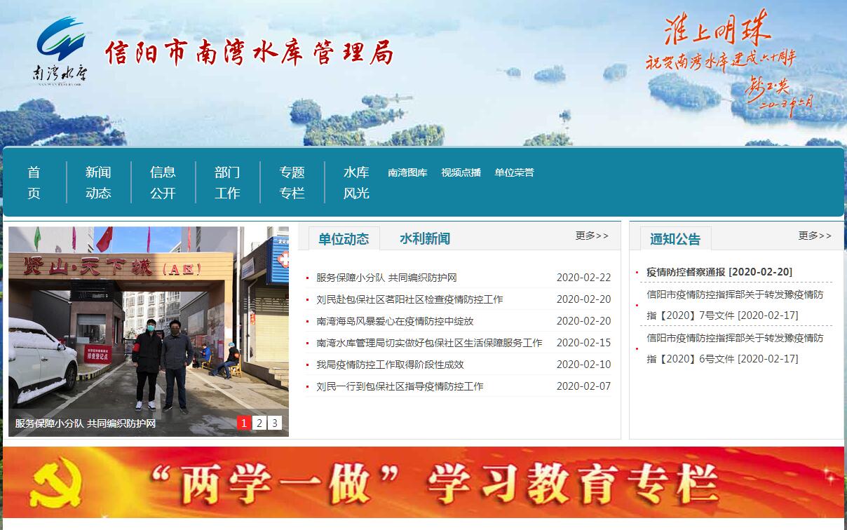 南湾水库是建国初期为治理淮河、发展水利而兴建的大型水利工程,以防洪、灌溉为主,兼顾发电、养殖、城市供水及旅游开发等综合利用的大型水库。水库大坝位于信阳市西南6公里处淮河支流浉河上,控制流域面积1100平方公里,多年平均降雨量1240毫米、多年平均来水量4.78亿立米,水库工程于1952年12月动工,1955年11月建成蓄水。水库现有防洪标准为万年一遇洪水,相应洪水位110.41米,库容13.4亿立方米。水库枢纽工程由大坝、主溢洪道、土门副溢洪道、输水道及电站等五大建筑物组成。灌区设计灌溉面积11.24万亩;电站装机6800千瓦(技改增容后),年均发电量1500万度;水库目前年城市供水8000万立方米。水库养殖水面7万亩,年捕捞鲜鱼150万斤。南湾水库保护着下游信阳市30万人民生命财产和65万亩农田以及京广铁路、宁西铁路、107国道、312国道、京珠高速公路、京九光缆、西合光缆等国家重要基础设施的防洪安全,是信阳市城市防洪的唯一可靠屏障。同时,水库是信阳市区唯一的饮用水源,是灌区内农业旱涝保收的可靠保证。水库运用50年来,拦蓄超信阳市安全泄量的洪水52次,其中洪峰流量超过4000立方米/秒(相当于20年一遇)的洪水4次;抗旱供水56亿立方米,共产生防洪兴利效益240. 16亿元,其中防洪效益139.13亿元,兴利效益101.03亿元,为信阳国民经济发展作出了巨大贡献。南湾水库管理局隶属信阳市南湾管理区,为正处级事业单位。现有职工870人,其中在职职工660人,离退休人员210人;在职职工大专以上学历259人,中级以上技术职称61人。南湾水库管理局内设机关科室11个,下设南湾灌区管理处、水电站、水产站、防汛通讯站、综合经营管理站、工程处、基建局、财务集中支付中心8个正科级二级单位。南湾水库在财务管理上实行自收自支、自负盈亏的管理方式,近年来,年均收入2400万元。南湾水库管理局自2002年被河南省水利厅评为“Ⅰ级工程管理单位”,2000年以来连续保持了“河南省水利系统文明单位”荣誉称号。在继2002年被河南省委、省政府命名为“省级文明单位”之后,2003年、2004年、2005年又被河南省委、省政府命名为“省级优秀文明单位”,2006年被国家水利部授予“全国水利风景区建设管理先进单位”。南湾水库因其综合效益显著,风景秀丽宜人而闻名遐迩,是国家森林公园、国家级AAAA风景区,国家级水利风景区、省级风景名胜区,素有“豫南明珠”“中原第一湖”的美誉。以水库为中心南湾湖风景名胜区东西宽20公里,南北长50公里,水域面积70平方公里,汇聚了森林、岛屿、山峦、湖湾、池潭、瀑布、古迹等诸多自然及人文景观,有大小岛屿百余个,错落分布,景象各异;湖四周群山环抱,茂林修竹,峰峦叠翠。雄伟的大坝如同蛟龙横卧浉河,上游四望山因是革命根据地而闻名天下,坝东贤山隐藏着千年古刹“贤隐寺”和梁武帝的行宫梁王垒。整个景区将湖光山色、森林瀑布、人文景观融为一体,表现出“水、山、林、岛”和谐一致的自然风光,库区内物产丰富,是驰名中外的信阳毛尖茶叶的主要产地。
