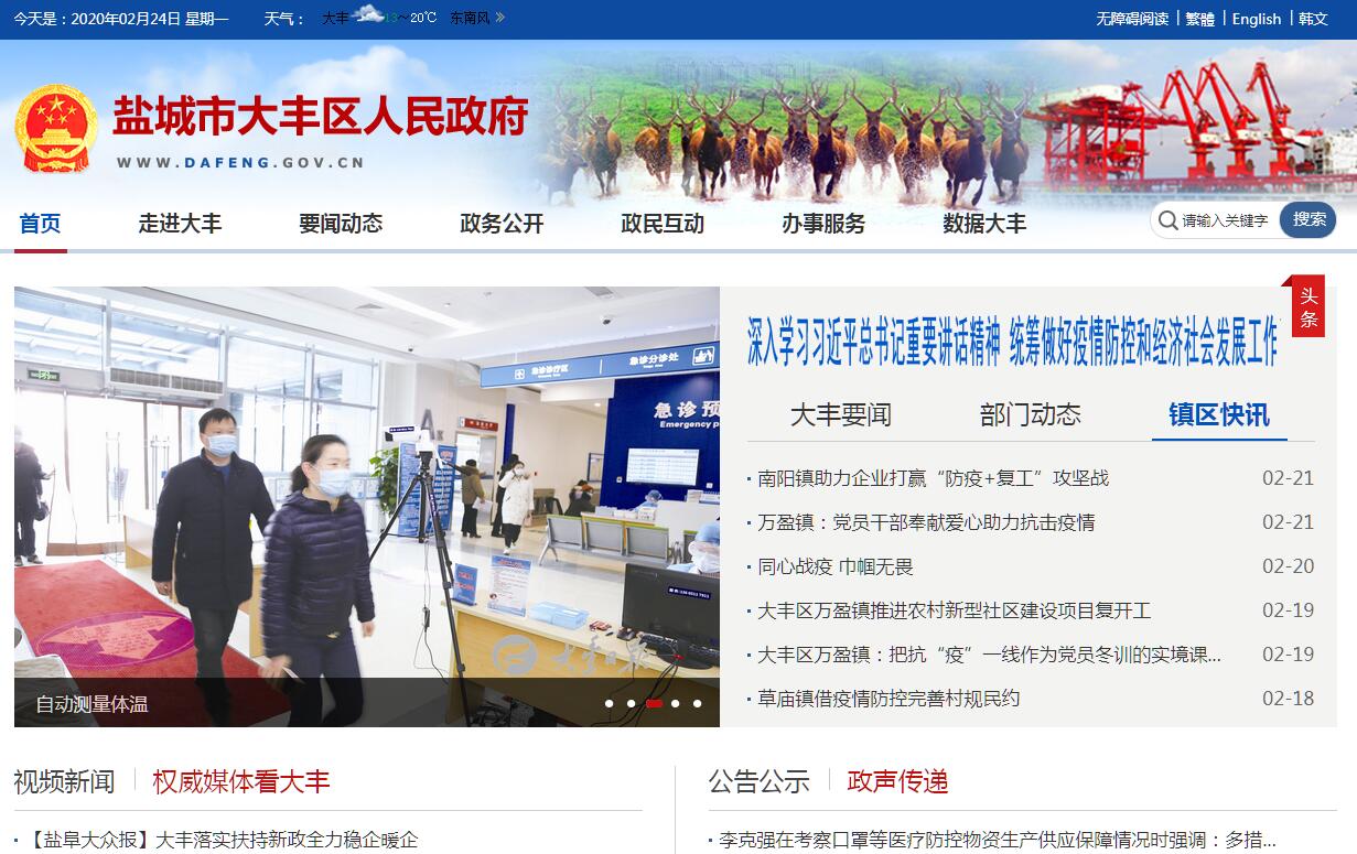 大丰区,是江苏省盐城市市辖区,地处江苏省东部、黄海之滨,位于北纬32°56′~33°36′,东经120°13′~120°56′,东临黄海,西连兴化市,南与东台市接壤,北与盐城市亭湖区交界,拥有112公里长的海岸线,总面积3059平方千米。大丰于1942年5月始设县,因时为东台属地,由东台北部析出,故命名为台北县,后因与台湾省台北县(今新北市)重名,于1951年8月更名为大丰县。1996年8月撤销大丰县,设立县级大丰市。2015年8月,撤销县级大丰市,设立盐城市大丰区。大丰区为中国麋鹿之乡,区内总面积3059平方公里,总人口72.54万人(2013年末)。辖2个街道、11个镇、两个省级开发区,境内有江苏省属农场和沪属农场各3个。大丰区是全国综合势力百强市辖区、县域经济百强市、中国优秀旅游城市、江苏省文明城市。2016年2月,盐城市大丰区被国家旅游局评为首批国家全域旅游示范区。盐城市大丰区人民政府电子政务办公室是参照公务员管理的正科级事业单位,2011年12月由大丰市经济技术信息研究中心和电子政务中心合并而成。主要职能是:承担盐城市大丰区人民政府门户网站运营维护、电子政务外网的建设与管理、区政府办公室官方微博“幸福大丰”等新媒体的信息发布、“12345”在线管理等职能。