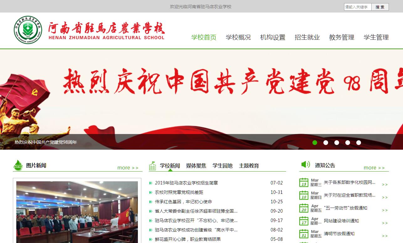 河南省驻马店农业学校是国家级重点中专、首批国家级改革发展示范校、河南省首批中职管理强校、河南省高水平中职高水平专业群建设示范校。2010年9月,驻马店农业学校与1903年建校的河南省汝南园林学校合并,组建新的河南省驻马店农业学校。目前,学校是省内为数不多的百年老校之一。新校区位于铜山大道与纬十路交叉口,占地300亩,建筑面积11万多平方米,于2012年12月31日正式开工,2016年8月1日正式投入使用,一期投资2.65亿元,学校为正处规格,核定编制数300人。目前学校在校生3686人,教职工254人,其中正高级职称3人,副高级职称78人,省职业教育专家3人,省级名师5人,国家职业资格考评员33人。学校设有农林科学系、汽车工程系、机械电子工程系、计算机科学系、经济管理系、动物科学系、德育部、基础部、体育部等9个系部,开设有现代农艺技术、园林技术、植物保护、畜牧兽医、计算机平面设计、汽车应用与维修、数控技术与应用、会计电算化等20个专业,固定资产3.6亿元,实验实训设备价值8000多万元,与夏南牛科技有限公司、河南名品彩叶苗木股份有限公司、泰国正大集团、富士康集团等62家企业合作共建了49个校外实习实训基地,近三年学生省级竞赛获奖总数达到72人次,省市级优秀教学成果奖一等奖100多人次。学校不断深化专业建设,建成了现代农艺技术和畜牧兽医两个特色专业,汽车运用与维护、计算机平面设计、现代农艺技术、物流管理与服务、畜牧兽医等5个全国首批示范性专业,每年培养的毕业生供不应求,自主创业的毕业生群体熠熠生辉。学校坚持开放办学的理念,不断加大校企合作与东西合作办学的力度,先后与民族特色餐饮集团曹运洪胡辣汤总店、青岛海洋技师学院合作办学,开设了中餐烹饪、航海技术、轮机工程技术等特色专业,增强了学校办学实力和招生引力。学校始终秉承“尚德、崇能、博学、力行”和“知行合一,日进日新”的办学理念,坚持学历教育与技能培训相结合,承担了河南省农业厅组织的基层农技人员、新型职业农民等培训和驻马店市大学生村干部等短期培训,年均5000人次。建校以来,为社会培养农、牧、林、工、经管等专业人才7万多人。学校是全国中等职业教育委员会农牧专业副主任单位、河南省职业教育就业指导委员会副理事长单位,是国家级机电实训基地、河南省百万中专生培训基地、河南省教师现代教育技术能力培训基地,还是河南省职业教育攻坚工作先进单位、河南省文明学校、河南省大中专生就业服务先进单位。