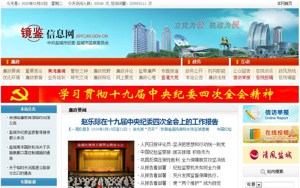 | 网站简介: 镜鉴信息网由中共盐城市纪委,盐城市监委主办,其性质是地方党的纪律检查和政府行政监察机关创办的用于交流发布信息、开展宣传教育、研究指导工作的非营利性的网站。其服务对象是广大党员干部、纪检监察干部以及所有关心、支持、参与反腐倡廉工作的社会各界人士。盐城市监察委员会是由盐城市人民代表大会选举产生,并向盐城市人民代表大会负责的国家监察机关。 |