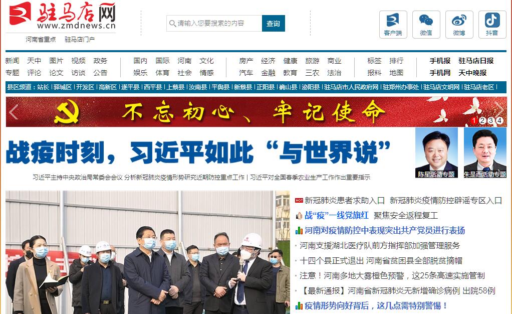 | 网站简介: 驻马店网,原驻马店新闻网是驻马店最具影响力的新闻网站,是世界了解驻马店的窗口,是中国门户网站中国网的组成部分,是在网上代表驻马店市委、市政府对外发布新闻信息的权威平台。驻马店网是由驻马店市委宣传部主管,驻马店日报社主办的我市具有新闻发布资质的综合性新闻网站。 |