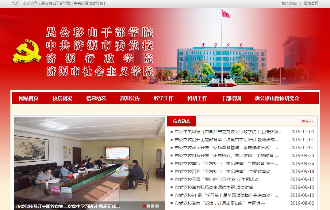 中共济源市委党校位于济渎大道东段,占地61.6亩,建筑面积20148㎡。党校始建于1944年5月。1997年8月,成立“济源行政学院”。2011年11月,济源市社会主义学院在党校挂牌成立,2013年3月5日,愚公移山精神干部学院挂牌成立,实行 “一套班子,四块牌子”,“一校三院”体制。学校现有多媒体教室、计算机室、语言室、远程网络接收站、图书室和普通教室共32个、多功能报告厅2个、各种规格的会议室6个。能够同时容纳1500余名学员学习,可供200余名学员住宿、500名学员同时就餐。建有网球场两个、篮球场两个、羽毛球场两个。2010年,被省委、省政府授予“省级文明单位”。全校共有教职工70名,其中高级讲师15名,硕士研究生15名。师资队伍涵盖了哲学、法律、经济、管理、历史、文学等近十个学科。还从社会各界特聘了17名专家学者作为学校的客座教授。学校内设科室11个,分别是办公室、行管科、教务科、监察室、科研科、函授站、基础教研室、法律教研室、党建教研室、经济管理教研室和电教中心。“教学是党校的中心工作”。近年来,市委党校积极探索干部教育培训工作的新思路、新方法、新途径,不断增强教育培训工作的时代性、针对性、实效性,走出了一条适应新形势发展要求的干部培训新路子。在教学内容上,坚持把马克思主义中国化最新理论成果作为干部培训的中心内容,强化“党校特色”;围绕济源市委、市政府中心工作设置专题课,突出“济源特点”;针对济源市经济社会发展中出现的重大问题和群众关心的热点、难点、焦点问题,开设专题课,彰显“时代特征”;总结河南省、济源市具有代表的地方历史文化、经济社会发展先进经验等,提炼课程,体现“地域特色”。在教学方式上,鼓励教师大胆尝试,积极探索推广“菜单式”、“案例式”、“研究式”、“体验式” 和“模拟式”教学,增强教学的趣味性和实效性。“科学研究是党校教育的基础”。按照“实践出题目、科研做文章、成果进决策”的思路,以服务教学、服务市委市政府中心、重点工作为出发点,充分发挥 “思想库”和“参谋部”的作用,深入调查研究,为市委决策提出建议和意见。“队伍建设是党校事业发展的关键”。每年年初邀请省委党校、高等院校和市领导为全体教职工授课,每周举行一次集体学习,督促教师时刻不忘学习,提高业务能力;每年分批组织教师到各级党校参加政策理论知识学习,提高理论水平;以增强社会实践为目的,组织教师到市委办、政府办、镇街道和重点企业进行调研,使教师不断丰富阅历,充实知识,提高能力。“行政管理和后勤服务是党校教学科研工作的重要保障”。积极稳妥地推进后勤工作的改革,逐步实现制度管理、目标管理和督查管理,把管理就是服务的工作理念引入各个环节,努力为教学、科研工作的正常有序开展提供有效保障。