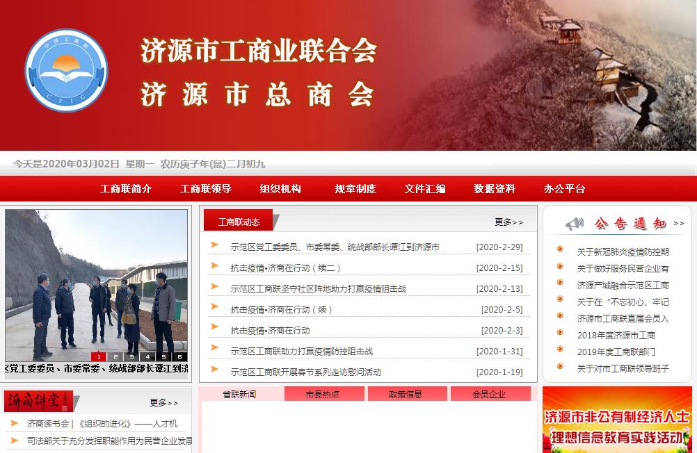 | 网站简介: 济源市工商业联合会成立于1953年,简称济源市工商联,1986年重新恢复,同时称济源市总商会。工商联具有统战性、经济性、民间性相统一的特征,作为党和政府联系非公有制经济的桥梁,政府管理非公有制经济的助手。通过专题调研、参政议政、团结引导、联谊交流、维权服务等形式,在济源政治、经济生活中已经并将继续发挥重要作用。济源市工商联成立以来,在济源市委、市政府的领导下,始终坚持团结、教育、引导、服务的工作方针,参与地方政府事务和经济、社会、重大决策的政治协商、民主监督、反映会员意见和要求,沟通会员企业与政府之间的关系,发挥政府联系管理非公有制经济的桥梁助手作用,为会员提供政策和信息、科技、管理、法律、会计、审计、融资、咨询等中介服务;为非公有制经济服务;为促进本地区经济发展服务,并在服务中发展壮大自身。截至2016年9月,济源市共有基层工商联组织19个,行业(异地)商会11个。 |