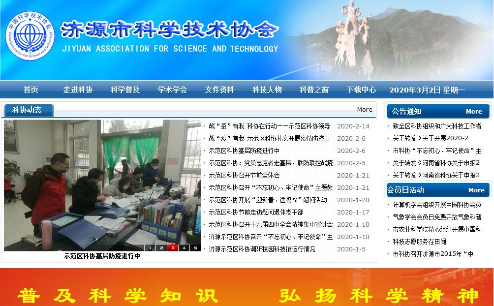 济源市科学技术协会是全市科技工作者的群众组织,是市委领导下的人民团体,是市委、市政府联系全市科技工作者的桥梁和纽带,是推动科学技术事业发展的重要力量。内设办公室和科学技术普及部,下辖济源市科学技术馆。市科协的宗旨是:团结和组织全市广大科技工作者,坚持马克思列宁主义、毛泽东思想,高举邓小平理论伟大旗帜,实践“三个代表”重要思想,深入贯彻科学发展观,围绕党和政府的中心工作,积极推动科教兴市和可持续发展战略的实施,建设创新型城市;促进科学技术的繁荣和发展,促进科学技术的普及和推广,促进科学技术人才的成长和提高,促进科学技术与经济的结合;代表和维护科技工作者的合法权益,为经济社会发展服务,为提高全民科学素质服务,为科技工作者服务。市科协的任务是:(一)开展学术交流,活跃学术思想,促进学科发展,推动自主创新。(二)拟定科协系统科普工作的具体计划,并组织实施;动员社会各方面力量,开展科普活动和青少年科技教育活动,推广先进技术;指导科技馆等科普设施场所的规划、建设。(三)反映科技工作者的意见和要求,维护科技工作者的合法权益,组织科技工作者参与本市科学技术政策、法规制定和本市地方事务的政治协商、科学决策、民主监督等工作。(四)表彰奖励优秀科技工作者及优秀成果,举荐人才。(五)开展科学论证、咨询服务,提出政策建议,促进科学技术成果的转化,接受委托承担项目评估、成果鉴定、专业技术职务资格评审等工作。(六)开展民间国际科学技术交流活动,促进国际科学技术合作,发展同国外科学技术团体和科学技术工作者的友好交往。(七)开展继续教育和培训工作。(八)编辑出版科学、技术和科普书、报、刊,兴办科普和科技活动场所。(九)对所属市级学会履行业务主管单位的管理和监督职责。(十)开展捍卫科学尊严和反对邪教;反对愚昧迷信、伪科学、反科学的活动。(十一)承担市委、市政府及省科协交办的其他工作。