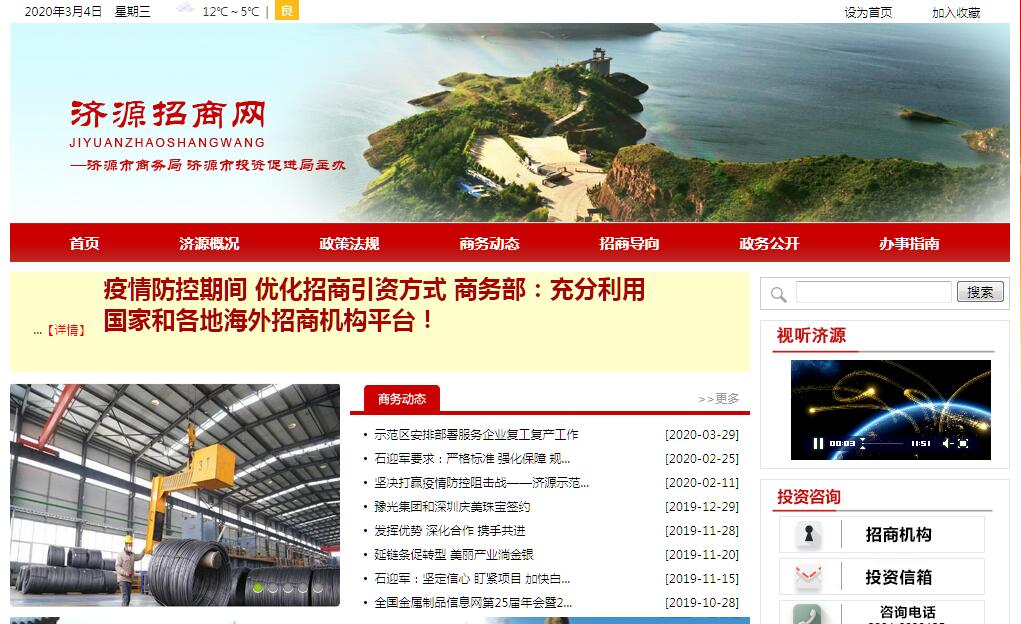 | 网站简介: 济源市商务局主要职责是:(一)贯彻执行国家、省、市对外开放、招商引资等方面的法律法规和方针政策;(二)负责全市招商引资和投资促进工作,组织筛选、发布吸引外商投资项目,建立招商项目库;(三)组织全市重大对外招商活动,指导全市行业招商、专业招商和委托代理招商活动;(四)参与全市投资环境考评、招商引资目标制定、检查、考核工作;(五)指导全市招商网络的建设;(六)负责在境内外派驻投资促进办事机构的队伍建设、人员选派和管理工作;(七)组织开展以济源市名义在境内外举办的各类市情说明会、投资洽谈会等投资促进活动;(八)参与全市招商引资、投资促进工作的调查研究,发现问题,提出对策,为市委、市政府决策提供依据;(九)完成市商务局交办的其它事项。 |