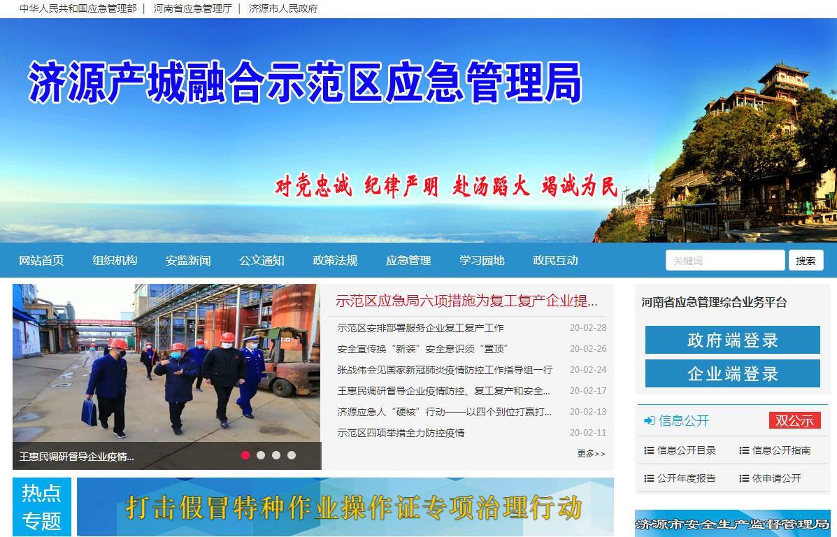 济源市应急管理局,为市政府工作部门。其主要职责是:1、贯彻执行国家和省安全生产法律、法规,组织起草全市综合性安全生产规范性文件,拟定全市安全生产规划并组织实施。2、承担全市安全生产综合监督管理责任,依法行使综合监督管理职权,指导协调和监督检查有关部门与各产业集聚(开发)区、镇、街道办事处的安全生产工作,定期分析和预测全市安全生产形势,研究、协调和解决安全生产中的重大问题,督促、指导落实安全生产责任制和安全生产责任追究制。3、承担工矿商贸行业安全生产监督管理责任,按照行业管理和属地管理的原则,依法监督检查工矿商贸生产经营单位贯彻执行安全生产法律、法规情况,安全生产条件和有关设备(特种设备除外)、材料、劳动防护用品的安全管理工作,重大危险源监控及事故隐患的排查治理工作;依法查处不具备安全生产条件的工矿商贸生产经营单位。4、承担全市煤矿、非煤矿矿山、危险化学品、烟花爆竹生产经营单位安全生产准入管理责任,依法组织实施安全生产准入制度并负责监督管理工作。负责危险化学品安全监督管理综合工作。5、承担全市工矿商贸作业场所职业卫生监督检查责任,负责职业卫生安全许可工作,组织查处职业危害事故和违法违规行为。6、研究提出全市煤炭工业发展政策和建议;拟定全市煤炭工业的发展规划、行业政策和技术标准并组织实施;组织全市煤炭、煤层气开发及综合利用,引导行业合理布局。组织协调煤炭行业技术的开发、推广和先进技术的引进、合作与交流。7、承担全市煤矿安全生产监督管理责任,拟定煤炭行业管理中涉及安全生产的重大政策,组织对煤矿企业贯彻执行安全生产法律法规、规章规程、标准和安全生产条件、设备设施安全及作业场所职业卫生等情况进行监督检查,依法对煤矿安全生产违法行为作出现场处理决定或实施行政处罚,指导、组织煤炭企业安全标准化、相关安全科技发展和煤矿整顿关闭工作,对重大煤炭建设项目提出意见,会同有关部门审核煤矿安全技术改造和瓦斯综合治理与利用项目,会同有关部门指导和监督煤矿生产能力核定工作。8、负责对全市煤炭经营市场进行监督管理,依法规范和整顿煤炭生产和经营秩序。9、负责组织指挥和协调安全生产应急救援工作,综合管理全市生产安全伤亡事故、事故隐患排查治理、安全生产和职业危害信息统计分析工作,依法组织、协调一般、较大生产安全事故的调查处理工作并监督事故查处的落实情况,协助上级调查处理重大、特别重大事故和煤矿生产安全事故。10、负责监督检查职责范围内新建、改建、扩建工程项目的安全设施与主体工程同时设计、同时施工、同时投产使用情况。11、指导协调全市安全生产检测检验工作,监督管理安全生产社会中介机构和安全评价工作。12、组织、指导全市安全生产宣传教育和安全文化建设工作,负责安全生产监督管理人员安全培训、考核工作,依法组织特种作业人员(特种设备作业人员除外)的考核工作和工矿商贸生产经营单位主要负责人、安全生产管理人员的安全资格考核工作,监督检查工矿商贸生产经营单位安全培训工作。13、组织拟订全市安全科技规划,指导协调安全生产重大科学技术研究、科研成果申报、推广和技术示范工作。14、指导协调和监督全市安全生产行政执法工作。15、监督、指导注册安全工程师、注册助理安全工程师执业资格考试和注册管理工作。16、组织开展全市安全生产方面的对外交流与合作。17、承担市政府安全生产委员会日常工作。18、承办市政府及市政府安全生产委员会交办的其他事项。