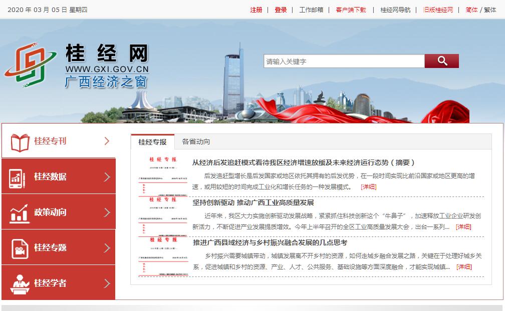 桂经网,广西经济门户,广西经济之窗。广西壮族自治区经济信息中心是1990年10月8日经自治区人民政府批准由原自治区计委电子计算站、区计委经济预测处、原广西经济信息中心三个单位合并重新组建成立,隶属自治区发展和改革委员会管理的全民所有制事业单位,也是国家经济信息系统的重要组成部分。广西经济信息中心内设一室六部,分别为办公室、综合部、经济监测预测部、信息资源部、电子政务部、网络管理部和网络建设部。中心现有干部职工125人(含聘用人员),其中:享受国务院特殊津贴、教授级高工1人,博士1人,高级职称专业技术人员21人,中级职称技术人员24人,初级职称技术人员40人。广西经济信息中心以参与和推动全区信息化建设为重点,为政务信息化建设提供全面的技术支持,为全区宏观经济发展提供监测、预测和决策参考,组织协调全区信息资源的开发利用,并为政府和社会提供丰富的信息内容服务。多年来,广西经济信息中心认真履行职责,努力创新机制,积极开拓业务,在经济预测与分析、政府信息化建设、信息资源开发利用等领域取得显著成绩。组织实施广西互联网络中心和广西电子政务外网(国家电子政务外网广西节点),已成为广西电子政务重要基础网络设施,建设和维护广西壮族自治区人民政府门户网站、自治区发改委门户网、桂经网、自治区发改委办公自动化(OA)系统、VOIP电话、电子地图等一批重要应用系统。