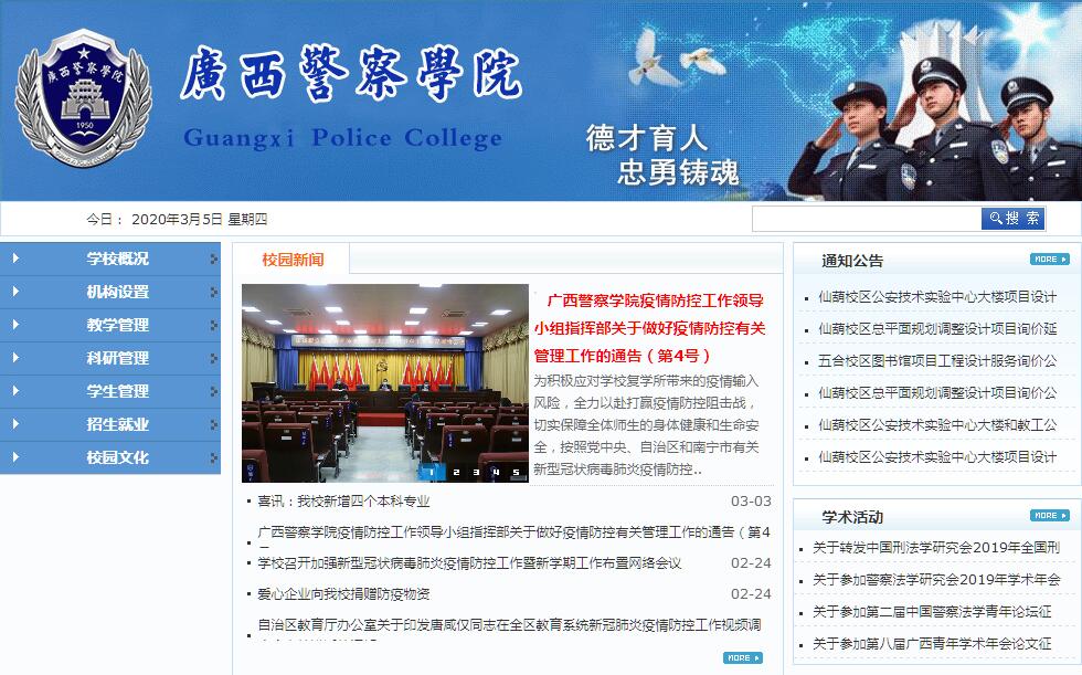 广西警察学院是广西唯一公安高等院校,是广西公、检、法、司、安等政法机关重要的人才培养基地。2018年广西政法管理干部学院整建制并入广西警察学院,实现了办学资源新整合。长期以来,学校始终坚持“政治建校、政治育警”方针,秉承“德才育人,忠勇铸魂”校训,经过一代代警院人的拼搏奋斗,学校不断发展壮大,已经成为八桂警官的摇篮和法律人才培养的沃土。学校位于广西壮族自治区首府、“中国绿城”、“联合国人居奖”获得城市南宁市,有长湖、仙葫、五合3个校区和北海训练基地,占地面积1869亩,校舍建筑面积37万平方米,教学科研仪器设备总值1亿多元,纸质图书100多万册,电子图书20多万册。校园风景优美、设施齐全,能满足学生日常生活需求。学生宿舍可直观江景,室内配备冷暖空调、太阳能热水。崭新的教室使用交互智能平板多媒体设备。田径场、游泳馆、警体馆等文体设施丰富了学生的课余生活。学校师资力量雄厚,有专任教师504人。其中二级教授1人、正高职称36人、副高职称125人,博士22人、硕士219人,双师型教师205人。有享受国务院特殊津贴专家、全国优秀教师、全国公安系统优秀教师、全国公安高等教育教学名师、自治区党委政府法律顾问、自治区人大立法咨询专家、广西法官检察官遴选委员会主任委员、广西十百千人才工程第二层次人才、广西优秀中青年法学家,公安科技专家等。广大教师潜心教学、无私奉献,换来了学校人才辈出、桃李满园。学校开设治安学、侦查学、监狱学等14个本科专业,法律事务、司法助理、民航安全技术管理等17个高职高专专业。其中,侦查学、治安学为广西重点学科;禁毒专业为公安部重点专业培育点;法律事务专业为自治区级优势专业;侦查学、治安学、禁毒学、刑事科学技术为广西本科高校特色专业及实验实训教学基地(中心);空中乘务及空中安保、民航安全技术管理为校企合作培养专业,学生入学即有机会与厦门航空、吉祥航空、青岛航空等航空公司签订定向培养协议,向“入学即就业、上岗即高薪、入职即高端”目标努力。学校实行严格的警务化管理,落实“一日生活制度”,做到日常生活条令化、行为举止规范化、内务卫生标准化,培养学生严谨、朴实、高效的学风和作风。经过多年努力,学校形成了独具特色的系统化、嵌入式政法人才培养模式,与区内各市公安局、各级人民法院、检察院、司法行政机关、各大律师事务所共同培养和优先录用毕业生。学校完善“教、学、练、战”一体化警务实战教学体系,将各种警务应用平台直接引入课堂,设有65个校内实验室、65个校外实习实训基地和禁毒研究中心、东盟警务研究中心等9个紧贴行业的特色研究机构,实现了教师教学、学生学习、上岗就业的零距离融合。建校以来,学校向全区公、检、法、司、安等政法机关输送毕业生6万余人,有全国公安系统一、二级英模13人,全国特级优秀人民警察13人。校友中现在岗的有厅级干部40多人、处级干部1000多人、律师事务所主任副主任100多人、知名企业家200多人。学校毕业生就业率常年保持在97%左右,全区公安队伍半数以上干警、全区基层法院检察院三分之一左右法官检察官为学校毕业生,他们战斗在维护边疆稳定、民族团结、国家安全、社会和谐的第一线,成为广西政法工作的中坚力量。学校充分发挥“育警”“屯警”“协警”功能,组建了全国公安院校第一支反恐处突学警预备队,参加历届中国—东盟博览会等重大活动安保工作,被公安部荣记集体三等功。校内文化生活丰富多彩,设有法协会、无人机爱好者协会等学生社团30多个,组建了国旗队、舞蹈队、语言表演队、警务技能表演队等。同学们利用课余时间发展爱好特长,实现综合素质的全面提高,在各类文体竞赛中成绩优异,荣获广西禁毒演讲比赛一等奖,广西禁毒微电影大赛一等奖,广西大学生气排球锦标赛男队冠军,广西大学生跆拳道锦标赛男子个人品势、混双品势第一名,高等学校民航服务形象与礼仪比赛银奖。“强警必强教,强警先强教”。当前,广西警察学院正在自治区党委、政府的坚强领导和关心支持下,以崭新的姿态、矫健的步伐,朝着建成“立足广西、服务行业、辐射东盟,西部同类院校领先、在国内和东南亚有较高知名度、行业特点和职业特色鲜明的应用型本科院校”目标迈进。