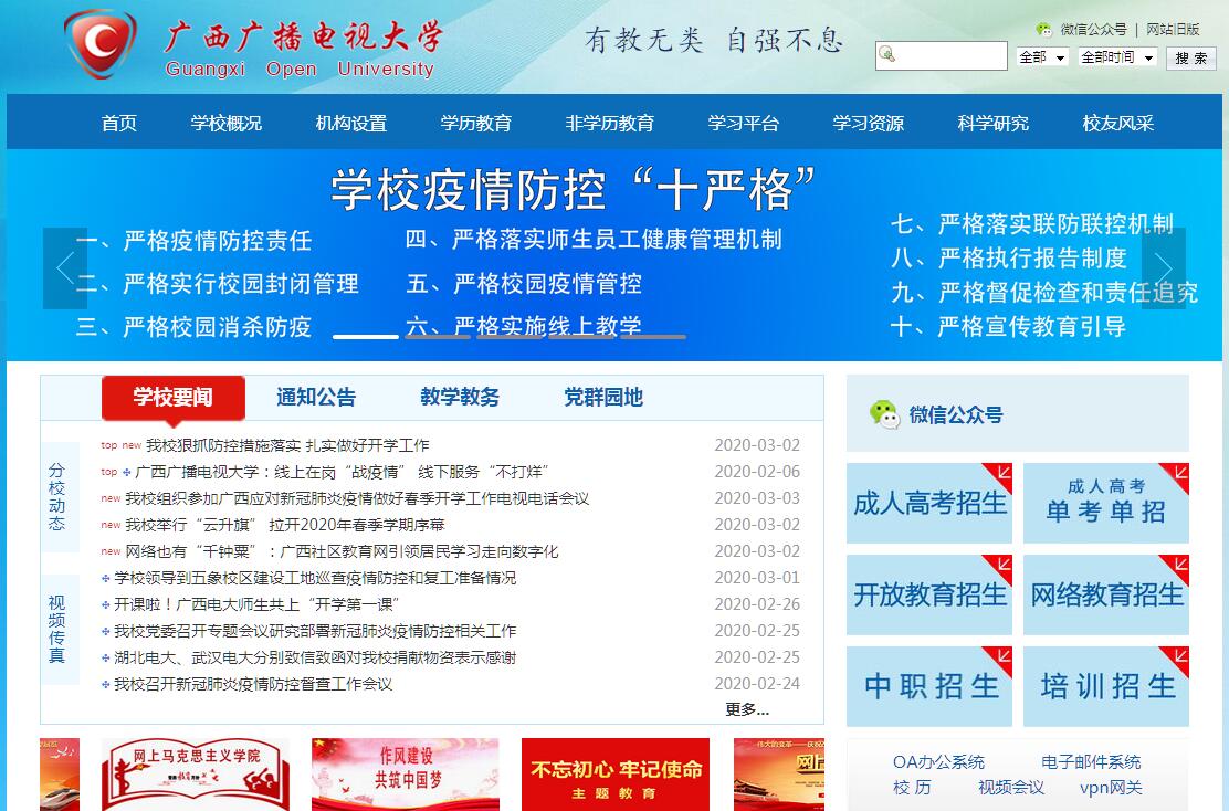 广西广播电视大学创办于1979年1月,由广西壮族自治区人民政府举办,广西壮族自治区教育厅主管,业务上接受国家开放大学(原中央广播电视大学)指导,是一所运用现代信息技术开展远程开放教育的新型高等学校,是中国广播电视大学系统和广西高等教育的重要组成部分。学校在全区共设立有14所市级和行业电大分校、80个学习中心和教学点,形成了基本覆盖全区城乡的远程教育办学网络。学校拥有两个校区——东宝校区和五象校区,分别位于南宁市青秀区东宝路和邕宁区龙岗片区龙祥路。学校不断完善线上线下相结合的教育教学环境和学习支持服务体系,建有满足开放教育和职业教育需求的各类实验实训室、图书馆、数字化资源库及在线学习、社区教育、创新创业等多种网络平台,同时是广西远程教育服务中心、广西高等学校人文社科重点研究基地——广西现代远程教育研究中心、广西教师教育培育基地和国家数字化学习资源中心广西中心。全区电大系统共有教职工700多人。校本部现有在职教职工243人,其中,具有高级职称64人,具有博士硕士学位者127人。学校常年聘请海内外专家、学者和行业岗位能手作为客座教授、兼职教师,逐步形成了一支能够适应现代远程开放教育发展需要的专兼职师资队伍。学校教职工的教学科研能力不断提升,公开发表学术论文、论著、教材的数量质量明显提高,获自治区级以上科研课题立项逐年增加,获自治区级以上教学科研成果奖项数量逐步上升。学校开设有104个开放教育本、专科专业,39个成人高等教育本、专科专业,与国内7所重点院校合作开设72个网络教育专业,形成了多层次、多形式的人才培养模式,现有各类学历教育注册学生7万余人。建校以来,累计培养各类毕业生40余万人,为全区各地特别是基层、行业输送了大批留得住、用得上的应用型人才。学校积极服务我区全民终身学习,在自治区教育厅指导下成立广西社区教育指导中心,建设广西社区教育网(桂知网)、广西社区教育资源库和一批社区教育线下实践基地,初步构建广西社区教育服务体系,将优质社区教育资源输送到全区各地,为推动广西学习型社会建设作出积极贡献。学校加强与政府部门、企业、行业协会、高校合作,积极承担“农民工求学圆梦行动”“国培计划”、“区培计划”、“村级两委”干部培训等项目,主动服务我区义务教育均衡发展,广泛开展职工教育、老年教育、新型农民与农民工教育和各类培训,为不同区域、领域、行业的人群提供相适应的教育服务。学校积极开展对外交流与合作,是国际远程开放教育理事会(ICDE)、亚洲开放大学协会(AAOU)成员,与美国、英国、德国、日本、韩国、泰国等国家以及香港、澳门、台湾地区的同类高校建立了联系。2016年,与清华大学“学堂在线”合作成立“学堂在线广西分中心”,为全区高校开展慕课式教学改革提供技术支持。学校正在按照《教育部关于办好开放大学的意见》、《教育部关于“十三五”时期高等学校设置工作的意见》和《广西教育事业发展“十三五”规划》等文件要求,加快广西开放大学建设步伐,积极筹建广西信息职业技术学院,努力实现学校转型发展,为构建我区的终身教育体系、建设学习型社会,促进地方经济建设和社会发展做出更大贡献。