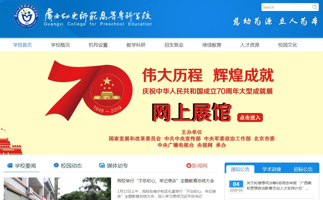 广西幼儿师范高等专科学校现有南宁校区、平果校区、武鸣校区三个校区,占地总面积1900余亩,总建筑面积约15.24万平方米。学校现有全日制在校学生12113人,成人教育学生2258人,八十余载办学深耕学前教育,已发展成为广西学前教育人才培养的“领头羊”、广西幼儿园园长的“摇篮”。目前,学校全面推进“双高”建设和内涵建设,努力实现建设全国领先、特色鲜明、开放发展、校园和谐、社会满意的高水平学前师范院校的目标。学校办学历史悠久。学校的前身,是1938年我国著名幼儿教育家张雪门创办的北平香山慈幼院桂林分院广西幼稚师范学校,开创了广西全日制幼儿师范教育的先河。此后,学校几度迁址,几易其名,2009年升格为广西幼儿师范高等专科学校。学校秉承“慈幼为源,立人为本”的校训精神,共为国家尤其是广西培养了10万多名幼教人才。学校办学特色鲜明。学校设有7个教学系部和学前教育、特殊教育等25个专业(方向),建有广西儿童发展与教育研究中心、特殊儿童关爱服务中心、附属幼儿园1所(自治区级示范幼儿园)和206个校内实习实训室、250多个校外教育实习实训基地。广西壮族自治区幼儿教师培训中心、广西特殊教育师资培训中心挂靠我校,有附属实验幼儿园1所(自治区级示范幼儿园)。近年来,学校形成了以学前教育为龙头、以特殊教育为特色、以艺术特色为亮点的特色专业群,构建广西一流、国内先进的职前职后一体化的幼教、特教师资培养培训基地。学校师资素质优良。学校有专任教师248人,具有高级职称75人,客座教授和兼职教师200多人。1个团队入选广西高等学校高水平创新团队,1人入选广西高校卓越学者,4人入选广西高等学校优秀人才资助计划。教师教研科研成果显著,2009年以来,获市厅级以上教研科研项目240项(省部级及以上27项);荣获国家级教学成果奖二等奖1项,省部级教研科研成果奖19项。学校人才培养成果丰硕。2014年以来连续4年获得广西高校毕业生就业创业工作先进单位。2009年以来,学生在技能比赛中荣获国家层面三等奖以上奖项561项,自治区级三等奖以上奖项1201项(一等奖302项),其中,荣获2019年全国职业院校技能大赛(高职组)学前教育专业教育技能赛项团体二等奖1项、艺术技能(声乐表演)赛项三等奖1项,第十八届“群星奖”1项,全国民族地区职业院校艺术教育展演金奖、铜奖各1项。2个歌舞节目登上中央电视台1号演播大厅。学校社会声誉良好。学校为国家教育体制改革试点技术支撑单位、中央财政支持重点专业建设单位、教育部首批教育信息化试点单位、全国职业院校残疾人康复人才培养改革试点单位、全国学校艺术教育工作先进单位、全国校园文化先进单位、国家级幼儿教师示范性集中培训项目培训机构、优质省级职教师资培养培训基地、自治区示范性教师教育基地、广西高校师范教育能力提升计划基地、广西学前教育教学法基地、广西学前教育示范性实训基地建设单位。