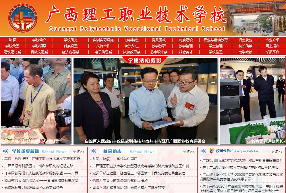 广西理工职业技术学校是国家公办中专学校,是第一批国家中等职业教育改革发展示范学校,是国家重点中专学校。校园占地面积1239亩,现有在校生33218人,其中中职生23142人,高职生10076人,函授专、本科1646人。教职工总数1334人,专任教师1193人,其中教授、副教授职称318人,双师型教师955人。校舍建筑面积39.77万平方米,教学设备达12041万元。学校建有游泳池、室内体育馆、健身楼、KTV练歌房、大型超市,配有独立卫生间、热水供应的学生公寓。建有中央财政支持的建筑类实训基地、服装设计与制作实训基地;自治区财政支持的汽车应用与维修、数控操作实训中心、模具操作实训中心、建筑装饰实训基地、制冷与空调设备运用与维修实训基地、机电技术应用实训基地、会计实训中心、计算机及应用实训基地、旅游服务实训中心、幼儿教育综合技能实训中心;华夏基金支持的物流实训中心,以及实训条件优良、设备先进的电工电子、硅酸盐、商务类、酒店服务管理类、烹饪技能类、美容美发类等校内实训基地19个,实验实训中心(室)240个,校外实习基地208个。学校还是自治区贫困村劳动力转移就业培训基地、国家建材特有工种技能鉴定站、中国建筑装饰协会培训工作站、信息产业部电子计算机行业技能鉴定站等十个实训考证基地。学校坚持以服务发展为宗旨,以促进就业为导向,以需求者为中心,秉承“人人有才,人人成才,人人出彩”的教育思想,构建现代职业教育体系,打通职业教育学生从中职到研究生的深造通道,搭建人人皆可成才的“立交桥”,实现技术技能人才的系统培养。以建设“国际水准、全国一流、广西第一”的职业院校为目标,坚持立德树人、质量立校、特色发展的办学理念。在日常管理工作中,我校贯彻“五个三”的办学理念和“七个一”的工作思路,坚持实行“三段七级评教”的教学管理模式,“渔翁得利”的后勤管理模式和“九全九美”的学生管理模式。学校获得社会广泛认同,先后荣获第一批国家中等职业教育改革发展示范学校、国家级重点中专学校、国重复评及教学水平评估“双优秀”、中国职教社-黄炎培优秀学校、全国职业教育先进单位、中国企业教育培训机构百强、全国职业教育管理创新学校、全国德育管理先进学校、全国关心成长模范学校、全国“十一五”教育科研先进集体、全国中等职业学校百佳网站单位、全国文明风采优秀学校、自治区文明单位、广西依法治校示范学校、广西德育工作先进单位、全区职业教育先进单位、自治区卫生优秀学校、自治区和谐学校、自治区绩效考评先进单位、自治区扶贫培训先进单位、全区学生资助工作先进单位、广西中等职业学校教科研“20强”、自治区级示范性中等职业技术学校等光荣称号。连续多年参加全区中等职业教育技能比赛获奖人数第一、获奖总数第一、金牌总数第一。