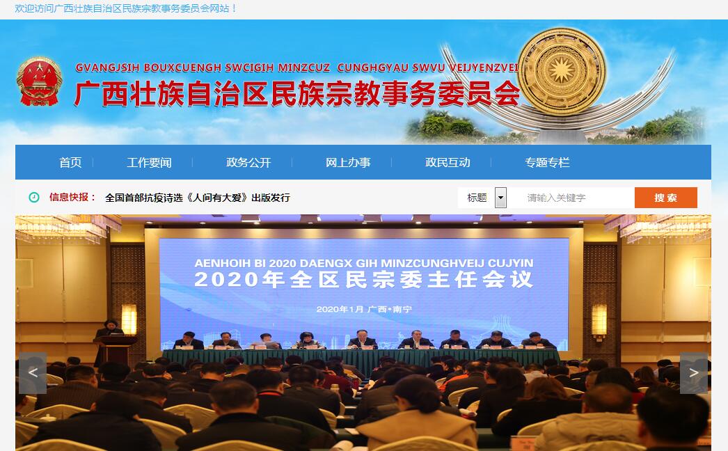 广西壮族自治区民族宗教事务委员会为广西壮族自治区人民政府组成部门,为正厅级,加挂自治区少数民族语言文字工作委员会牌子,归口自治区党委统战部领导。其主要职责是:(一)组织开展民族宗教理论、政策和民族宗教工作重大问题的调查研究,提出有关民族宗教工作的政策建议。对民族宗教政策和法律法规执行情况进行督促检查。组织开展民族宗教理论、政策、法律法规和基本知识的宣传教育工作。(二)负责协调推动自治区民族工作委员会委员单位及其他有关部门履行民族工作相关职责,促进民族政策在经济发展和社会事业有关领域的实施、衔接,对政府部门开展民族工作进行业务指导。(三)负责提出广西民族宗教事务地方立法项目的建议,起草自治区有关民族宗教事务地方性法规、规章草案和规范性文件。保障少数民族合法权益,依法保护公民的宗教信仰自由和正常的宗教活动,维护宗教界合法权益。联系自治县(含享受自治县待遇县)、民族乡,指导民族区域自治法的贯彻落实。(四)研究提出协调民族宗教关系的工作建议,协调处理民族宗教关系中的重大事项,参与协调少数民族聚居区社会稳定工作,推动民族团结进步创建活动,促进各民族共同团结奋斗、共同繁荣发展。指导全区民族宗教事务工作,协助全区各级人民政府妥善处理涉及民族宗教方面的群体性事件和影响社会稳定问题。(五)负责拟订少数民族事业等专项规划,监督检查规划实施情况,参与拟订少数民族和少数民族聚居区经济社会相关领域 的发展规划,促进建立和完善少数民族事业发展综合评价监测体系,推进实施民族事务服务体系和民族事务管理信息化建设。(六)研究分析少数民族和少数民族聚居区的经济发展和社会事业方面的问题并提出特殊政策建议,配合做好少数民族聚居区的扶贫事宜。组织协调少数民族聚居区科技发展、经济技术合作和民族贸易、民族特需用品生产政策的落实。(七)会同财政部门管理少数民族发展资金、寺观教堂维修专项经费、宗教团体补助经费,参与其他有关少数民族聚居区专项资金分配、管理和监督。(八)承办自治区民族团结进步表彰活动和自治区成立逢10周年的庆祝活动,组织指导自治县(含享受自治县待遇县)、民族乡成立逢10周年的庆祝活动。(九)研究少数民族教育、文化、科技、卫生、体育、广播 影视、新闻出版等方面的问题并提出政策建议,会同文化和旅 游、体育部门承办全区少数民族文艺会演和全区少数民族传统体育运动会相关事宜,组织参加全国少数民族文艺会演和全囯少数民族传统体育运动会。协助做好“壮族三月三”活动整体策划和 顶层设计等相关工作。在教育主管部门的总体规划指导下,研究民族教育改革发展问题并提出政策建议,帮助解决民族教育中的困难,配合教育主管部门承办对少数民族聚居区的教育援助、民族教育扶持和民汉双语教育的有关事宜。指导民族图书、报刊、广播影视的出版发行和民族古籍的搜集、整理、规划、出版工作。(十)负责少数民族语言文字的学习、使用、翻译、研究、 发展、抢救、保护、传承工作。组织开展少数民族语言文字规范化、标准化、信息化工作。组织少数民族语言文字考试测试工作。负责指导少数民族语言文字的学习使用和翻译工作。(十一)责对宗教团体和宗教界人士进行爱国守法、拥护社会主义、维护祖国统一和民族团结、维护社会稳定教育。做好巩固和发展同宗教界人士的爱国统一战线工作。帮助宗教团体在宪法和法律范围内按照自身特点独立自主开展工作,帮助做好宗教教职人员的选拔、培养工作。(十二)负责宗教行政审批工作,重点管理自治区一级宗教团体。会同有关部门做好对涉及宗教内容的宣传品的审查工作。 配合政法部门揭露和打击利用宗教进行的违法犯罪活动。(十三)负责组织协调民族宗教工作领域有关对外和对港澳台的交流与合作,做好涉及民族宗教事务的对外宣传工作,办理有关少数民族、宗教界涉外事宜。指导宗教团体和宗教界人士按照独立自主自办原则和外事纪律开展对外交往,抵御境外敌对势 力利用宗教对我进行渗透活动。协同有关方面处理宗教涉外事宜。(十四)参与拟订少数民族人才队伍建设规划,联系少数民族干部,协助有关部门做好少数民族干部的培养、教育和使用工 作。负责宗教界人士的培训、培养工作。组织开展和指导干部教育培训工作。(十五)完成自治区党委、自治区人民政府交办的其他任务。