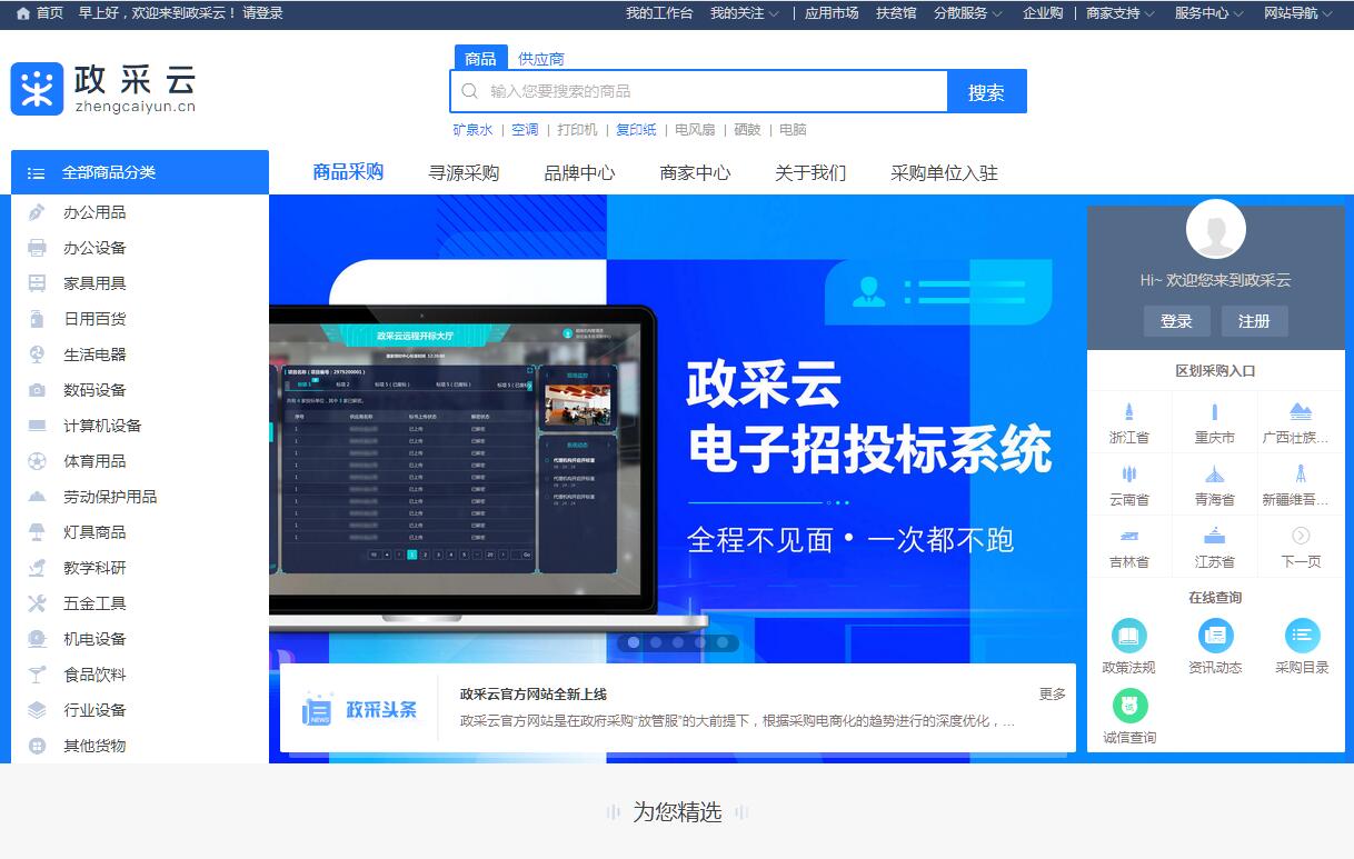 | 网站简介: “政采云”是政府采购云计算服务平台的简称。以互联⽹网为基础,充分运⽤用云计算和⼤大数据技术,以政府采购电子化交易易和管理理为重点,涉及政府采购全流程、各领 域、多⽤用户,集政府采购⽹网上交易易、⽹网上监管和⽹网上服务为⼀一体的综合性云服务平台。政采云有限公司由浙江省财政厅与阿里巴巴集团合作推动,于2016年8月成立。专注于为政企采购提供全方位、全流程的电子化平台服务及专业的运营服务。公司坚持独立、开放、共享、公正的原则,遵循“政府定规则、市场建平台、属地化管理、专业化运营”的建设思路,以全球领先的互联网、云计算、大数据技术服务为核心,为政府采购、行业采购、企业采购提供全方位、全流程的电子化平台服务。同时,开放支持电商、供应链、金融、数据、第三方应用等各类伙伴接入,共享平台资源,共同打造政企采购云服务生态。 |
