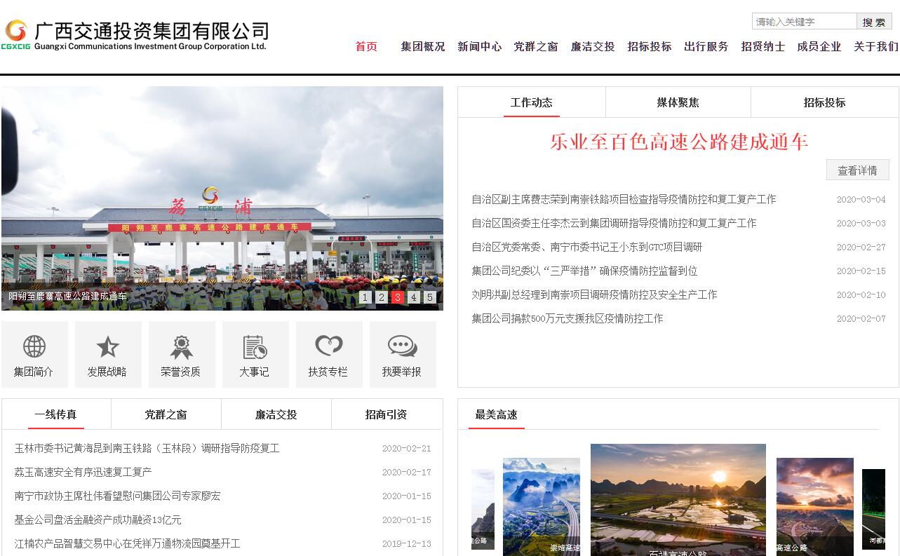 广西交通投资集团有限公司成立于2008年7月。按照自治区党委、政府部署,2018年9月,广西交通投资集团有限公司、广西铁路投资集团有限公司实施战略性重组,组建新的广西交通投资集团有限公司,是广西壮族自治区人民政府直属企业,是我区重要的投融资主体和国有资产经营实体,肩负推动广西高速公路、铁路建设任务。集团注册资本300亿元,截至2018年12月底,资产总额3550亿元,净资产1190亿元,全资二级子公司74家,控股二级子公司15家,参股公司8家,在职员工15700多人,获得投资级国际评级,是广西第二家拥有双AAA主体信用评级的企业。截至2018年12月底,集团投资建设高速公路项目40个,建设里程4041公里,概算总投资3210亿元。累计完成投资2200亿元,占广西同期高速公路投资约70%,28个项目建成通车,新增通车里程2438公里,占广西同期新增里程的84%。集团管养的高速公路里程3758公里,占广西的67.5%。落实地方配套出资责任,积极参与广西铁路建设,自主投资建设南宁至崇左、南宁至玉林城际铁路,推动我区高铁运营里程达到1771公里,位居全国各省区市第一。按照自治区党委、政府部署,集团大力推进高速公路、铁路建设运营及附属业务、土地开发与经营、商贸物流、产业投资与金融、锰矿开采及深加工、交通信息化等业务,打造广西交通建设的主力军、广西产业发展的重要力量、广西产融结合的典范。