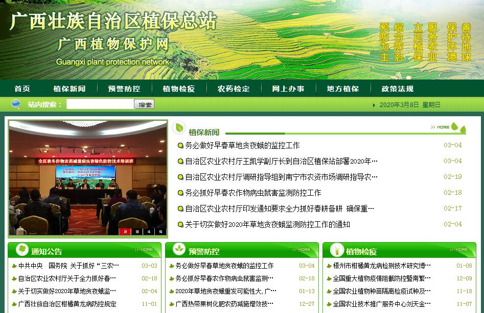 | 网站简介: 广西壮族自治区植保总站是1979年5月经自治区编委同意成立的全额拨款的正处级事业单位, 主要负责农业植物保护的具体事务性和技术性工作。2011年11月经自治区人民政府批准为参照公务员法管理的事业单位,主管部门为自治区农业厅。其主要职责有:一、履行政府社会管理和公共服务职能。1、负责农作物病虫预测预报;2、指导重大病虫灾害防治;3、推介农药安全使用技术。二、执行国家相关法律法规职能。1、负责植物内部检疫,2、负责农药检定管理监督,3、负责农产品质量安全检测。 |