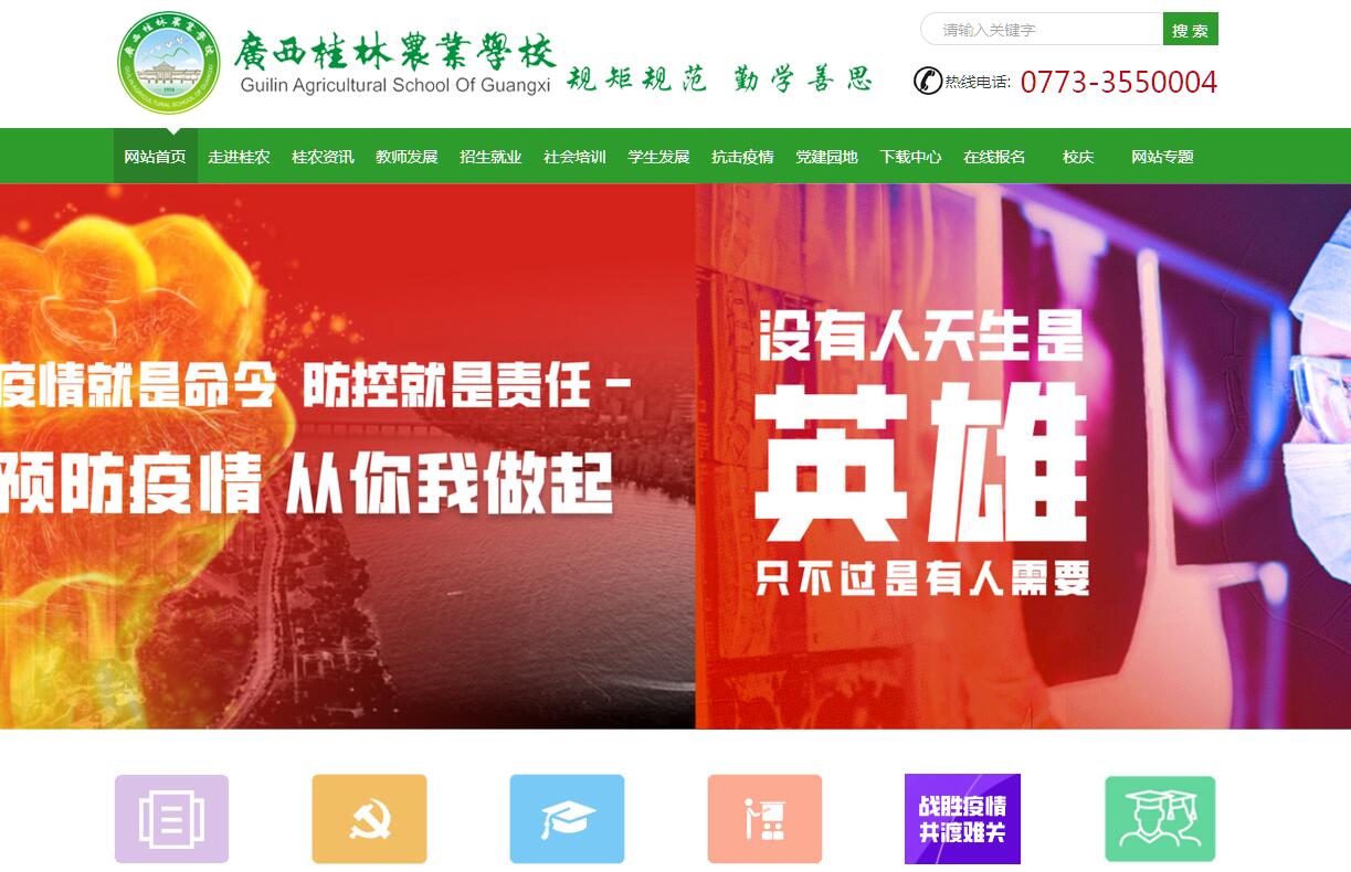 广西桂林农业学校始建于1958年2月,直属于自治区农业厅,为自治区重点和自治区示范特色中等职业学校,先后获自治区文明单位、自治区教学水平评估优秀学校、自治区卫生优秀学校、广西森林校园、自治区和谐学校等20项荣誉称号。学校位于桂林市雁山区大学城,占地面积413.9亩,在校生3358人。学校以“助推产业结构升级、服务行业技术进步、培养技能型人才、服务终身学习”为办学目标,秉承“团结协作、锲而不舍”的大雁精神,遵循“规矩规范 勤学善思”的校训,构筑“乐业、敬业;树区内特色职教示范,创国家一流职教品牌”的学校愿景。学校以内涵建设为主线,以优质高效为目标,以服务为宗旨,以就业为导向,以师生发展为根本,坚持“以农为本、多元发展”的专业建设思路,成功由一所纯农类的普通中专学校转型为一所综合性的学生成才,家长放心,社会满意的自治区重点和示范特色学校。“诚信民主、合作感恩、追求卓越”蔚然成风。学校现开设有现代农艺、现代服务、机电与信息技术三个专业群,果蔬花卉生产技术、园林技术、农业机械使用与维护、观光农业经营、畜牧兽医、农村经济综合管理、旅游服务与管理、高铁乘务、汽车运用与维修、计算机应用和电子电器应用与维修共11个专业。学校采取“2+1”(2年在校学习、1年到企业顶岗实习)三年制普通中专、“2+3”或“3+2”学制直升高职和凭学校推荐参加对口升本科考试三种培养模式,真正实现了“升学有通道,就业有能力”。学校采取校企合作、工学交替、企业委托培养订单办学模式和“理实一体化”教学模式培养一专多能、一书多证的高素质技能型人才。学校拥有孙中山先生命名的“岭南第一名园”——雁山园,有教学楼和实验实训楼6栋,公寓式学生宿舍楼5栋,图书综合楼1栋,学生食堂1栋,校舍建筑面积75009平方米。有300米塑胶跑道、田径运动场、足球场和体育馆各1个,校内实训实验室79个,拥有中央和自治区财政支持建设的校内实训基地5个,拥有装机容量为500台电脑的计算机房,设备总价值达2575万元。学校还与区内外知名企业合作建立校外实训基地20个。学校是全国农业职业技术教育培训示范基地、农业部农村合作社人员培训基地、广西现代农业技术培训基地、自治区水库移民培训基地、广西贫困村劳动力转移就业培训基地,广西新型职业农民培育基地。学校充分整合学校与社会优质资源大力开展新型职业农民培育、水库移民创业就业培训、基层农技推广人员培训、职业技能鉴定考证培训、行业从业人员岗位培训等,充分利用现代农业示范展示园、涉农企业、农业专业合作社、家庭农场等生产基地开展田间地头教学,真正把课堂办到农村、把技术送到家里,年均培训达3000人次,为助推产业结构升级、服务行业技术进步、服务终身学习和服务精准扶贫发挥了重要作用,为推进“三农”建设做出了积极贡献。学校现有教职工142名,其中专任教师128名。中高级职称69人,“双师型”教师占专业课教师总数的85%。2008年以来,教师编写公开出版教材35部,编写特色校本教材12部,公开发表论文262篇,获奖论文53篇,承担各级课题和项目共48项。在中职学校职业技能大赛中取得优异成绩,获自治区级及以上奖励一等奖5人次,二等奖19人次,三等奖68人次。近五年来,共516名学生通过对口升学进入高校深造,毕业生就业率均达98%以上,为服务区域经济发展做出了积极贡献。