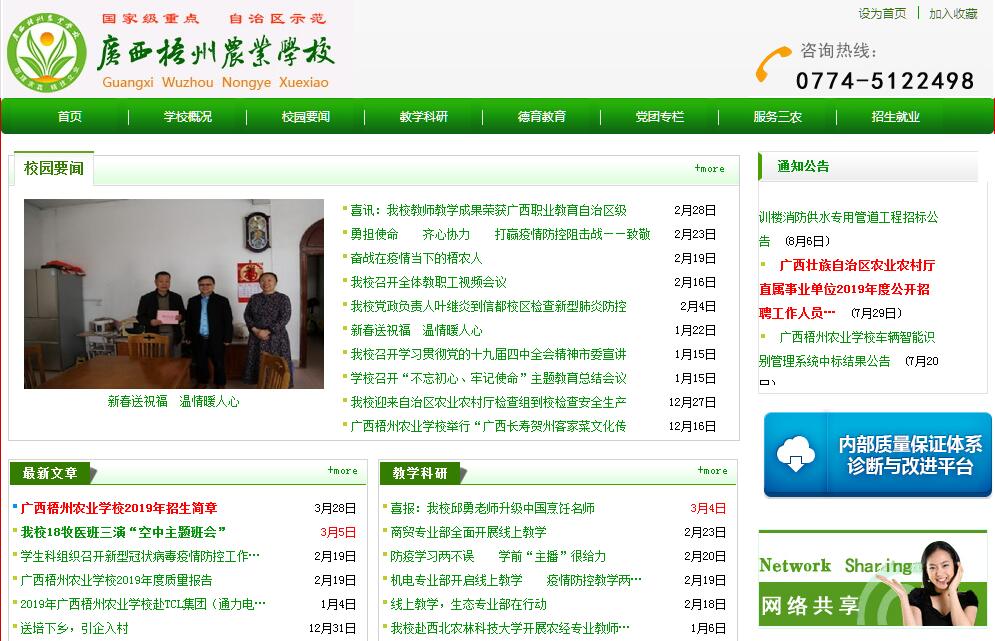 广西梧州农业学校,座落于素有“湘桂粤三省通衢”之称的贺州市,分为八步校区和信都校区,是广西示范性中等职业学校和贺州市唯一一所自治区直属的国家级重点中等职业学校。学校创办于1956年6月,隶属自治区农业厅。由于年代的更迭和历史变迁,她曾二度下马、三迁校址、四易校名,可谓道路曲折、历程艰辛。2001年根据时代办学趋势,创办了桂梧高中,实行两块牌子,一套人马办学。而今,学校拥有两个校区,占地面积160亩,其中八步校区位于市中心,占地面积52亩,信都校区占地面积108亩。校舍建筑面积为71036.6㎡ ,实习实训教学场馆33421㎡,拥有配套齐全的教学、图书、实训设备及生活体育设施,设备总值3000多万元。现有65个教学班,全日制在校生达到4700人。学校现有教职工213人,其中在职专任教师146人,具有研究生学历17人、本科学历114人,“双师型”教师82人,自治区名师2人,中高级职称78人,技师6人。学校设有畜牧兽医、果蔬花卉生产技术、农业机械使用与维修、农村经济综合管理、观光农业经营、计算机应用、电子商务、数控技术应用、汽车运用与维修、汽车商务、会计、学前教育等18个专业,涵盖农、工、商、贸多学科,其中畜牧兽医、计算机应用、数控技术应用为自治区示范性专业。学校办学模式灵活,有全日制中职、普通高中、特色高中、成人在职及短期培训班,学校与广西大学、广西师范大学等联合办学,是广西贫困村劳动力转移就业培训基地和广西库区移民劳动力就业培训基地。2016年10月,由广西壮族自治区农业厅与贺州市政府共建的广西桂东职业农民学院已批复。近五年,各类短期培训5000余人。学校秉承“以人为本,教育为先;求实强能,多元提升,和谐发展”的办学理念,重视学生的思想品德教育,抓好专业技能教学,致力于为高校输送优秀的毕业生,为社会培养技能型人才和高素质的劳动者。学校的就业率保持在98%以上,60年来为社会输送各类人才达4万余人。学校办学成绩显著,在全国、全区科技和职业技能等各类大赛屡创佳绩。潘中田、谢小青老师荣获2015年广西科学技术进步奖二等奖,教职工在2015年广西中等职业学校教师职业技能大赛中荣获团体三等奖1个,个人二等奖2个,三等奖3个。2016年,荣获全国职业院校大赛中职组三等奖1个,全区职业技能大赛中职组一等奖1个,二等奖7个,三等奖10个,勇创历史新高。桂梧高中办学15年,取得了跨越式发展,近年高考本科上线率保持72%以上,在贺州市同类学校中名列前茅,李盛等一批优秀学子被清华大学等全国著名高校录取。学校连续13年获得自治区农业厅年度工作目标责任绩效考评优秀等次,荣获“全国创建和谐校园先进单位”、“全国学校青少年道德培养实验基地”、“全国职业教育管理创新学校”、“全国师德建设示范单位”、“自治区教育厅中职招生先进单位”、“自治区文明卫生学校”、“自治区卫生优秀学校”、“自治区文明单位”、“自治区和谐学校”、“广西五四红旗团委”、“贺州市花园单位”、贺州市先进基层党组织”等荣誉称号。学校将主动适应国家经济发展方式转变、结构调整、产业升级战略的人才需求,遵循职教办学运行发展规律,加大改革创新与各项建设力度,努力把学校建设成为办学实力显著增强、服务功能整体提升、质量特色鲜明的广西示范中职校。