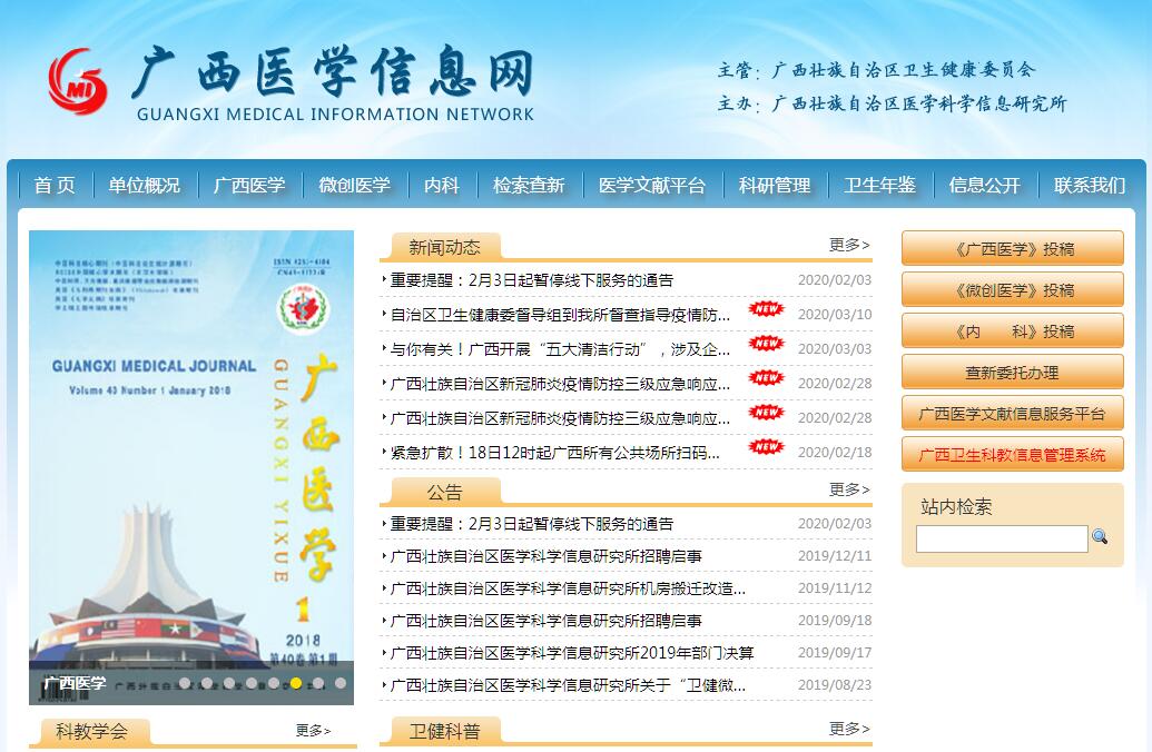 广西壮族自治区医学科学信息研究所,隶属于广西壮族自治区卫生健康委员会,是财政全额拨款事业单位,前身为《广西卫生》编辑室。1975年1月经广西壮族自治区编制委员会批准,将《广西卫生》编辑室改为广西壮族自治区医学科学情报研究所,2016年3月经广西壮族自治区编制委员会批准改为现名。1980年获准将《广西卫生》更名为《广西医学》杂志,1988年经广西壮族自治区编制委员会批准,定为县(处)级事业单位,核定事业编制40人。主要职责为:承担医学科学信息的搜索、研究、整理、推广、服务等工作;承担卫生健康科研管理的事务性工作。2018年在职职工40人,其中专业技术人员31人,高级技术职务10人(正高3人)。编辑出版三种医学学术期刊——《广西医学》(中国科技核心期刊)、《微创医学》和《内科》,提供医学科技查新与信息咨询服务,开展卫生健康政策研究,担负广西壮族自治区科技厅和广西壮族自治区卫生健康委员会下达的各项卫生健康信息调研任务,为广西卫生健康事业发展提供信息支撑服务,为领导决策服务,为医学临床、教学、科研及医药生产第一线服务。 设有《广西医学》编辑部、《微创医学》编辑部、《内科》编辑部、查新咨询部、卫生健康政策研究室、科技教育科、信息科、《广西卫生和计划生育年鉴》编辑部、《广西通志·医疗卫生志》编辑部等科室,挂靠有广西卫生科教管理学会办公室。拥有广西医学信息网(网址www.gxmi.com、www.gxmi.net),开通了广西医学文献信息服务平台、广西卫生科教信息管理系统;购置了知网数据库、万方数据库、维普数据库、生物医学文摘库(CBM)、解放军医学图书馆生物医学数据库(CMCC)、ProQuest Dialog等中外文生物医学数据库,文摘数据量22187万条,全文数据量22394万条;馆藏图书资料30多万册。