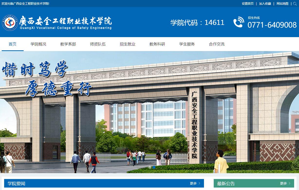 广西安全工程职业技术学院(以下简称安职院)是2017年3月由广西壮族自治区人民政府批准设立的公办全日制普通高等院校,由自治区人民政府与国家应急管理部(原国家安全生产监督管理总局)共建,由自治区应急管理厅(原自治区安全生产监督管理局)举办、建设和管理,广西壮族自治区教育厅业务指导,是全国第三所安全类高职学院。学院地处南宁教育园区,交通便利,区位优势明显。学院占地面积1057亩,规划总建筑面积28.7万平方米,规划总投资9.68亿元。学院服务定位“立足广西,面向全国,辐射东盟”。秉承“以服务安全生产、培养应用人才”的办学宗旨,明确了“把学院建设成为国内同类高等职业院校先进的,具有区位优势和特色的高等职业院校”的办学目标;坚持立德树人,以培养适应企业安全生产需要的高素质技术技能人才为根本任务。学院坚持走省部共建、校企合作、工学结合之路,突出安全技术与管理人才的培养培训,具有鲜明的办学特色。自治区人民政府与国家应急管理部(原国家安全生产监督管理总局)签订了省部共建协议,在学院共建中国-东盟安全生产培训基地。学院已完成投资6.46亿元,建成教舍、实训厂房、公寓、学生食堂、运动场、图书馆等主体功能建筑15.3万m2;至年底预计累计完成投资7.8亿元,19万m2建筑,基本建成教学、运动、实训、住宿、行政等五个功能区。具备6000名在校生规模的办学能力。2020年,学院计划投资3亿元,完成近9万m2配套建筑,全面完成规划建设任务,具备9000名在校生办学能力。截止目前,学院拥有教师221名,其中副高及以上职称47人,聘请了在专业领域享有较高声望的区内外大学19名专家、教授担任学院客座教授和学科带头人。学院开设有安全技术与管理、建筑工程技术(工程质量与安全方向)、信息安全与管理、工程测量技术、机电一体化技术、会计、消防工程技术、工程造价、汽车检测与维修技术、救援技术、电子商务、摄影测量与遥感技术、无人机应用技术、环境监测与控制技术等14特色专业,已建成非煤矿山、矿井火灾、工程测量、财会等专业实训室共41个为学生实践活动创造良好的条件。学院已经与广西建工集团、信发集团、广西投资集团有限公司、中国建筑第八工程局、广西交通投资集团有限公司、广西新发展交通集团有限公司、广西西江开发投资集团有限公司、桂林福达集团有限公司、百色百矿集团有限公司和江苏汇博机器人技术股份有限公司等区内外大中型企业签订战略合作协议,搭建产教融合平台,开展订单、定向等方式培养人才,学生毕业有稳定的就业渠道。2019年,为响应国务院高职扩招100万号召,学院多措并举,共录取了4601名新生,招生规模实现“井喷式”发展,提前完成了自治区人民政府批复的办学规模,实现“双突破”,即突破了“三年办学在校生规模5000人”和“2019年3000人招生计划指标”两个目标。当前,学院教学秩序井然,教学质量稳步提高,学生安心学习,教育事业稳健发展。