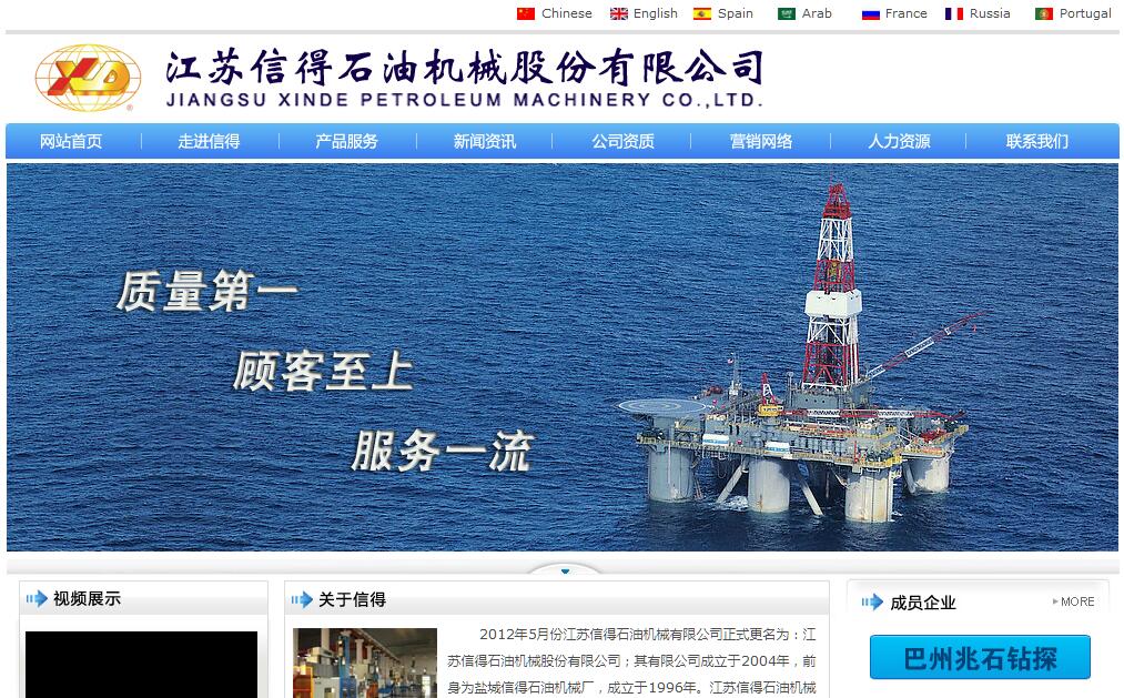 2012年5月份江苏信得石油机械有限公司正式更名为:江苏信得石油机械股份有限公司;其有限公司成立于2004年,前身为盐城信得石油机械厂,成立于1996年。江苏信得石油机械有限公司是中国石油天然气集团公司钻采设备一级网络成员,全国50强石油装备企业。占地约30万平方米,总投资1.70亿美元,员工1,500人,工程技术及相关专业人员占职工总数30%以上,公司拥有完善的质量管理体系,已通过ISO 9001,ISO 14001质量体系认证,取得了美国石油学会(API)的技术规范认证证书。公司配备了250多台复合数控机床以及常规的机械设备用以满足制造石油钻井设备的需要并建立了全国首家超高压气密封实验检测中心,去年产值达11亿元。本厂设有产品研制开发、加工制造、试验检测、售后服务等运行机制,向用户提供技术先进、质量优良、服务到位的产品。主要产品有防喷器、节流压井管汇、采油(气)井口装置、套管头、钻机、泥浆泵等。其产品适用于陆地和海洋平台,可以在H2S和非H2S的环境下使用,远销美国,欧洲,非洲,中亚,中东,东南亚等国外市场。我公司投资10亿元的二期工程正在建设中,投产后,将新增产值30亿元。