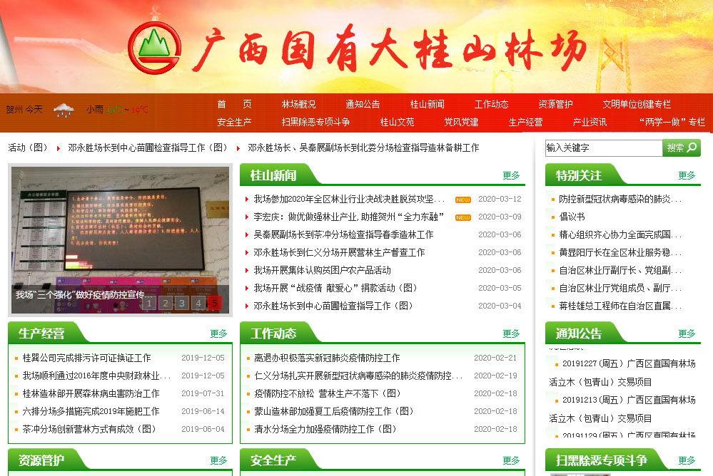 大桂山林场为自治区直属国有十三家林场之一,属于差额拨款事业单位,实行企业化管理。长期以来,在自治区林业厅的坚强领导和地方党委政府的正确指导下,大桂山林场以“贵山、贵树、贵人”为核心价值观,坚持“生态建设、产业发展和改善民生并重”的办场方针,以培育森林资源为根本,以经济效益稳步增长为中心任务,十二五期间各项产业均得到较好的发展。“十二五”期末,林场经营土地总面积63684.2hm2 (95.53万亩),其中场内43193.3 hm2 (64.79万亩),有林地面积37389hm2 (56.08万亩),森林覆盖率86.56%;场外经营土地总面积20490.9hm2 (30.74万亩)。场内外活立木总蓄积量520万m3;总资产27.5亿元。林场以营造速丰桉、松、杉等商品林为主导产业,并实施林板一体化项目,开发建设3000亩工业园区,开展木材综合利用加工。林场下辖清水、六排、东叶、北娄、和平、茶冲、仁义七个营林分场及贺州造林部、柳州造林部、桂林造林部等三个对外造林部;投资开办了广西桂巽板业有限公司、广西都庞岭木业有限公司、贺州市春天花卉园艺有限公司、贺州市桂山木材销售有限公司、贺州市桂丰林下种养有限公司、贺州市永拓贸易有限责任公司、贺州市桂山新能源有限责任公司等全资子公司;与广西华峰集团合资成立高峰桂山公司,占股30%。参股广西华泰资产管理有限责任公司、广西八桂种苗有限责任公司、广西华沃特生态肥业有限责任公司、广西华岭林业有限责任公司,各占股5%。总场设有办公室、党群办公室、计划财务科、监察审计科、产业科、人事教育科、营林科、市场营销科、林政资源管理科、安全生产与防火办公室、林业调查设计队、营林项目质量监理部、离退休人员工作办公室、后勤服务中心、林下经济管理办公室等部门。全场现有员工1779余人,其中场内职工954人(大专以上251人),聘请合同制工人625人。场内职工中在职471人,离退休483人,其中:高级职称3人,中级职称99人,初级职称(含技术员)145人。