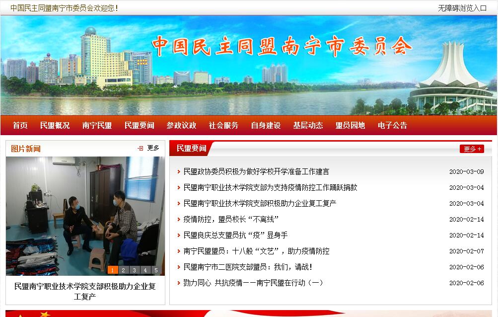 中国民主同盟(简称民盟)于1941年3月19日在重庆秘密成立(当时的名称是中国民主政团同盟,1944年改组为中国民主同盟),是中国共产党领导的爱国统一战线的组成部分,是同中国共产党通力合作的参政党,是主要由从事文化教育以及科学技术工作的高、中级知识分子组成的,具有政治联盟特点的,致力于建设中国特色社会主义事业的参政党。民盟在南宁市的活动始于1947年初,当时国立桂林师范学院迁至南宁,民盟广西省支部以该院的20多名盟员为主体,建立了民盟南宁地方组织。1951年初召开南宁市第一次盟员大会,成立民盟南宁市分部委员会;1956年改称为民盟南宁市委员会,至今已历第十二届。民盟南宁市第十二届委员会设参政议政工作委员会、教育科技文化工作委员会、社会服务联谊工作委员会;民盟南宁市委员会机关设驻会副主委、秘书长、办公室、组织科、宣传科、社会服务科,共有机关专职人员13人。下设江南、青秀、兴宁、西乡塘、邕宁等5个总支部、30个支部(小组)。截至2007年底,有盟员538人,其中,从事高等教育11人,占2%;普通教育343人,占63.8%;科文卫101人,占18.8%;其他83人,占15.4%。南宁市盟员中有十届全国人大代表1人,自治区十届人大代表2人,自治区九届政协委员4人;有10名盟员当选为市人大代表;20名成员担任市政协委员,其中副主席1人。在各城区的人大和政协中有人大代表5人,其中副主任1人;政协委员33人,其中副主席3人,常委5人。受聘担任自治区、南宁市、城区及有关单位特邀监察员、执法监督员、行风评议员共9人。民盟南宁市地方组织建立之初,在中国共产党的领导下,积极参加当时的反美、爱国学生运动。1949年解放前夕,民盟负责人刘润贤等按中共省委、市工委的布置,开展社会调查和收集情报工作,同时对旧警政人员进行策反工作,民盟盟员为迎接南宁解放做出了贡献。建国以来,民盟南宁市委员会坚持中国共产党的领导,坚决走社会主义道路,带领广大盟员积极参加社会主义建设。改革开放以来,特别是在新世纪新阶段,民盟南宁市委员会以邓小平理论和“三个代表” 重要思想为指导,贯彻落实科学发展观,引导盟员投身改革开放和经济建设,投身社会主义和谐社会建设。民盟南宁市第十二届委员会自2006年8月换届选举产生以来,在民盟广西区委和中共南宁市委的领导下,在中共南宁市委统战部的指导下,认真学习胡锦涛总书记的重要讲话精神,贯彻全国统战工作会议精神,牢牢把握正确的政治方向,在上届委员会卓有成效工作的基础上,努力开创工作新局面。坚持“以政治交接为主线,以自身建设和参政议政为重点”的工作方针,继续深入开展政治交接学习教育活动,继承和发扬民盟的优良传统;响应中共南宁市委的号召,在全市民盟基层组织中开展“和谐建设在基层”活动,不断加强自身建设。坚持开展“一总支一调研、一支部一提案、一人一议”活动,重点落实“党委出题、党派调研”任务,切实履行参政议政职能。按照民盟中央的要求,积极开展“农村教育烛光行动”,切实拓展服务社会形式和深度。在市委统战部的倡导下,在全市盟员中开展“双岗创优争先”活动,号召盟员为建设南宁建功立业。倡导盟员开展“泛北部湾建设问题”研究,为泛北部湾建设献计献策。民盟南宁市委员会,正带领所属基层组织和广大盟员,为我市建设区域性国际城市,构建和谐南宁而努力奋斗。