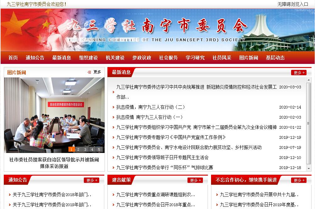 | 网站简介: 九三学社南宁市委员会,是具有政治联盟性质的、致力于建设中国特色社会主义和祖国统一事业的政党,是中国共产党领导的多党合作和政治协商制度中的参政党。为正处级全额预算拨款单位,内设三科一室。作为民主党派之一的九三学社主要职能是:参政议政、民主监督、参加中国共产党领导的政治协商。其主要职责和任务是:组织全市九三社员围绕我市中心工作开展参政议政、民主监督、社会服务工作,进行政治交接实践教育活动,积极推进“同心”品牌建设,做好九三学社组织发展和社员服务工作,以及完成中共南宁市委、市政府下达其他工作任务。 |