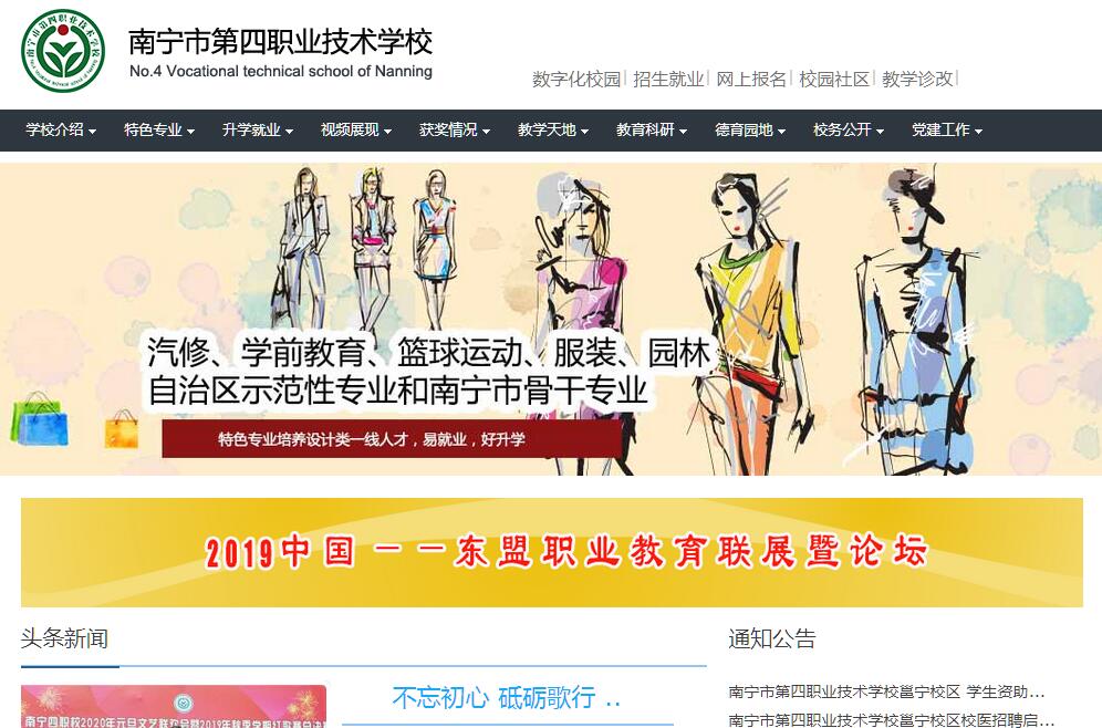 南宁市第四职业技术学校创办于1965年,是一所公办的自治区级重点中职学校和自治区级示范性中职学校。2012年成为国家中职教育改革示范建设学校。学校现有邕宁校区、竹溪校区和坛洛校区三个校区,占地面积681.29亩,建筑面积8.56万平方米。校园内高楼林立,气势宏伟,办公楼、教学楼、实验楼、实训楼、学生公寓楼等建筑错落有致,现代美观;高规格的篮球场、排球场、羽毛球场馆;400米和300米跑道的田径场各一个,尽显学校体育运动场地的魅力;图书馆藏书23.62万册;校内实训场地面积30000多平方米,90多间实训室,共有16个专业,校内4100多个实训工位,实训设备价值共4650万元。学校拥有完善的校园网及管理信息系统,计算机教室、仿真实训室、教学录播室、班班通多媒体设备满足教学与管理的需求,数字化教学资源库的建设支持着教师的教学活动,2015年7月学校被教育厅评选为广西教育信息化试点单位。以就业为导向,以服务为宗旨,注重培育学生良好品德和职业素养;坚持与生产劳动和社会实践相结合,有效提高办学质量,不断提升学生学习能力和技能水平。学校办学经验丰富,师资力量雄厚,全校现有专任教师307名。教学及辅助设施完善,实习设备齐全,实习手段先进,能充分满足教学和学生技能培养的需要。初步形成交通运输、文化艺术体育和学前教育三大专业群,以及汽车运用与维修、学前教育、运动训练、服装设计与工艺等特色鲜明的龙头专业。学校现有全日制中职学生8000余名。南宁四职校的建设与发展始终受到各级党委和政府的高度重视与大力支持。创办50多年来,学校先后为各行各业输送了数以万计的高素质技能人才,为广西经济建设的腾飞做出了突出贡献。
